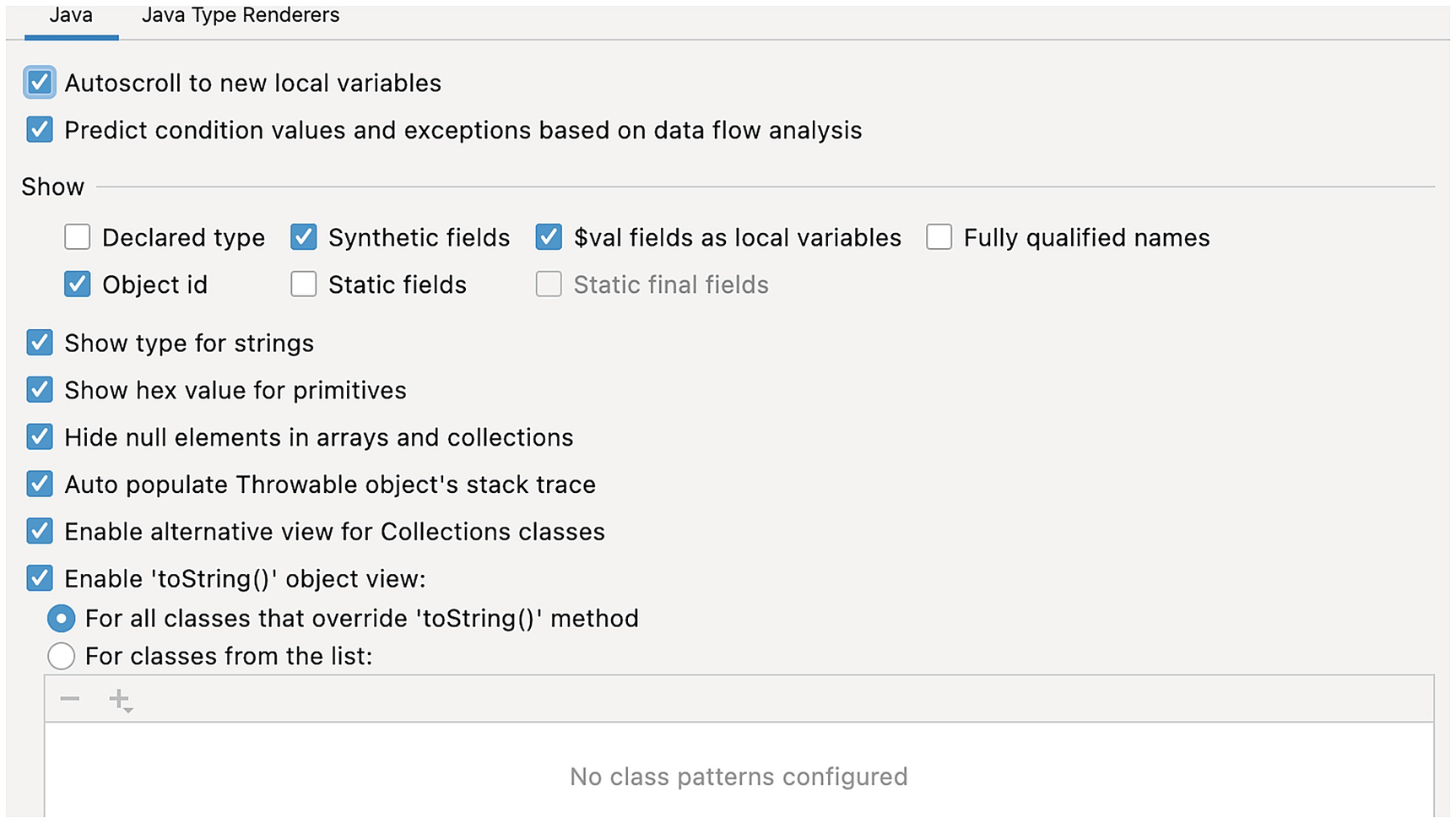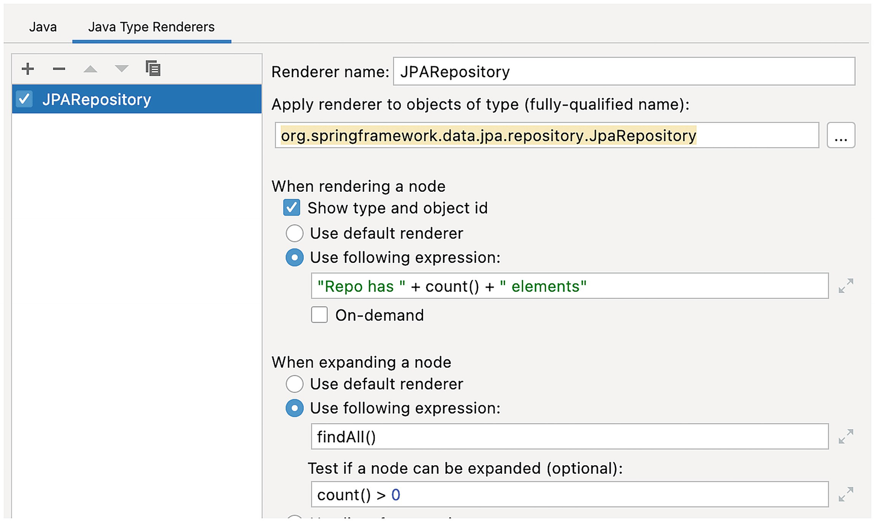 A renderer applies to a class (or base class) name. As you can see from Figure 1-10, we bind this renderer to the JpaRepository class. “When rendering a node” lets us define custom code to execute whenever the IDE needs to “decide” how an entry is displayed in the UI.