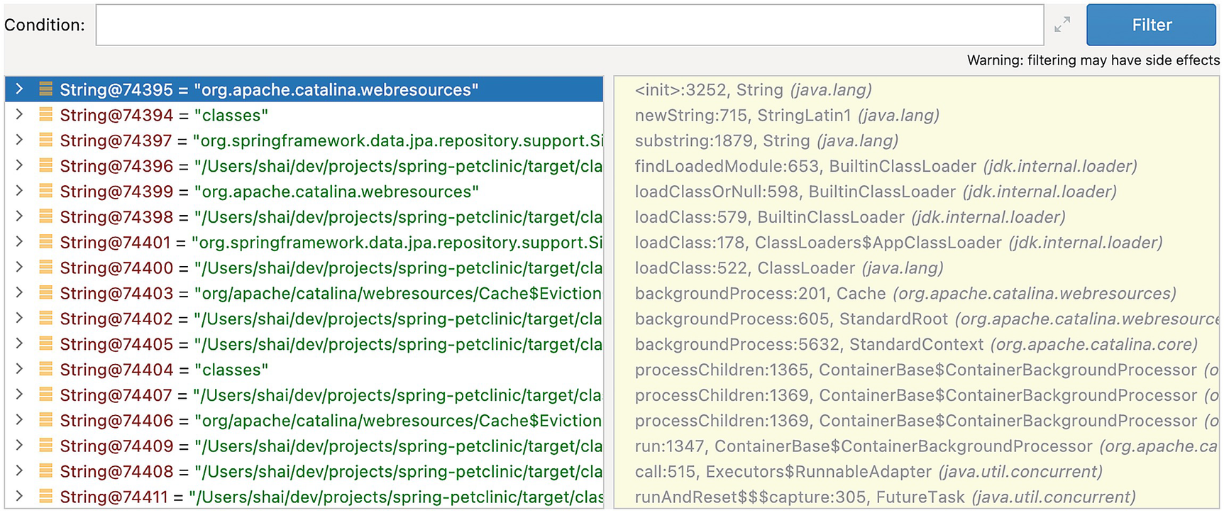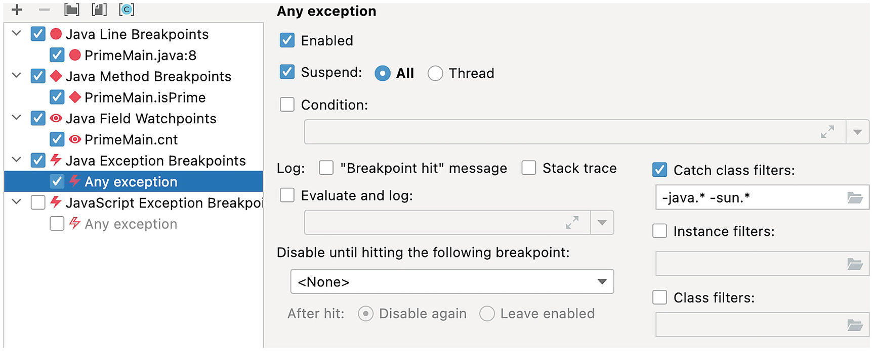 In the breakpoint management UI, we also have the ability to break on all exceptions. This isn’t a popular feature for JVM languages. The problem is that the JVM throws exceptions as part of normal execution. The solution for this is “Catch class filters” that let us ignore exceptions that are caught by specific classes.