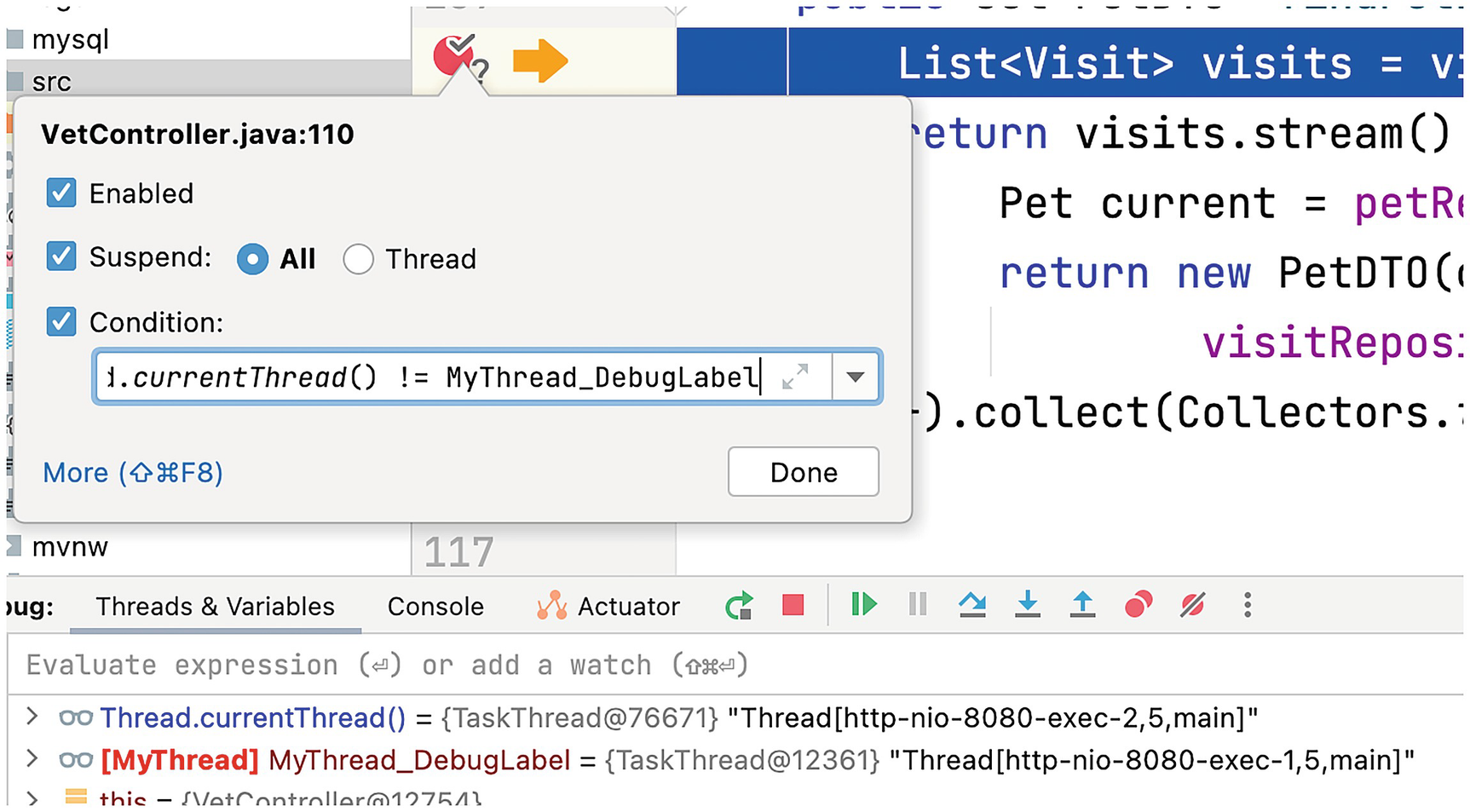 But the most interesting option is the suspend option. A typical breakpoint suspends all the threads when it’s hit. A tracepoint disables that behavior and prevents suspension entirely. IntelliJ/IDEA also includes another option of only suspending the current thread. This is very useful for multithreaded applications where we might need the background threads running while debugging.