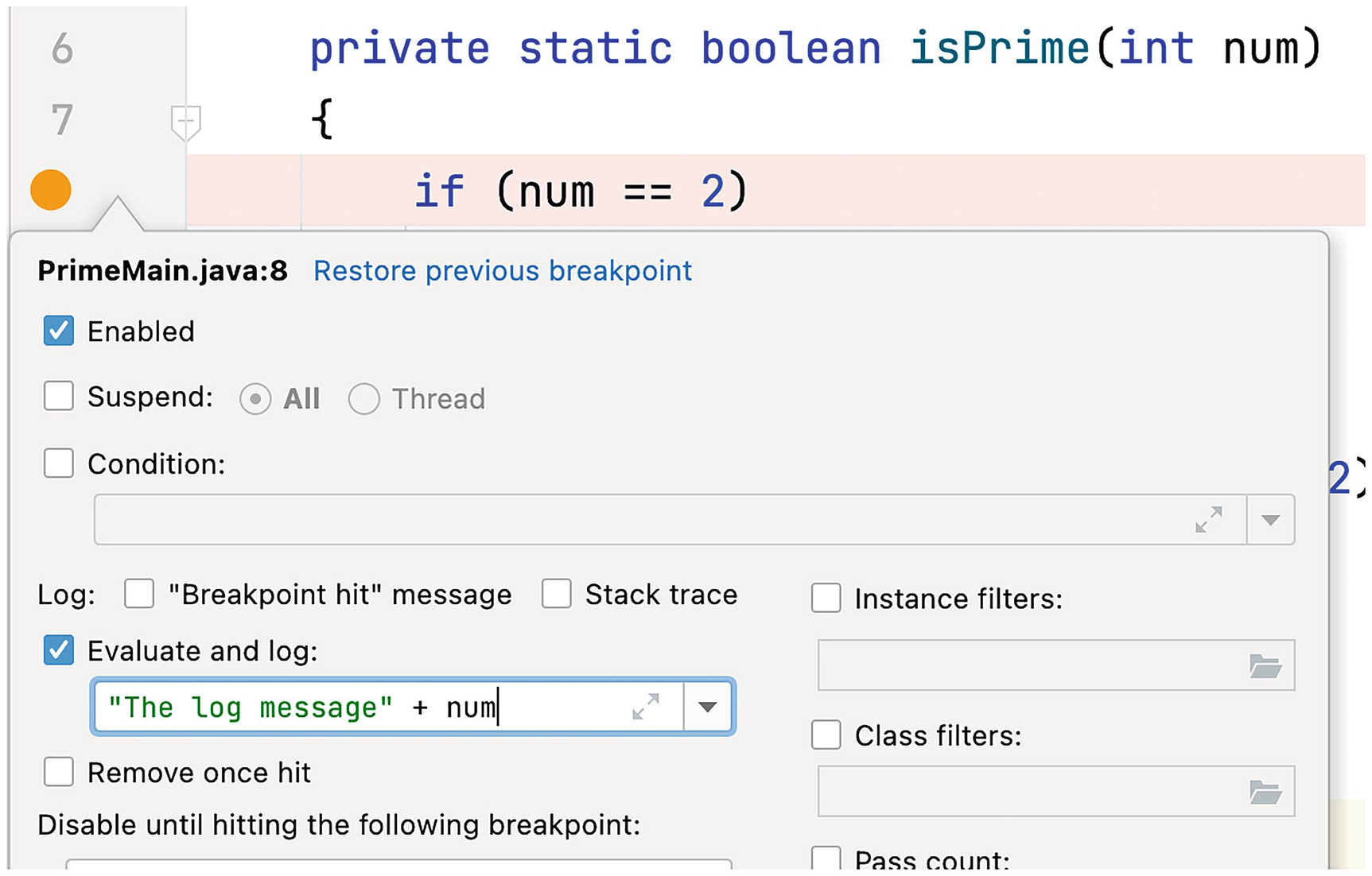 A screenshot of a few lines of code highlights the eighth line. A dialog box under the line indicates a textbox under evaluate and log option. it text reads the following text, the log message, + num.