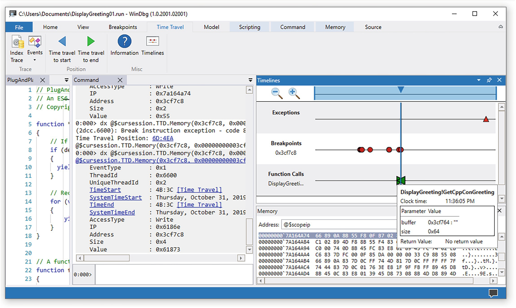 Chapter 5: “Time Travel Debugging” – Time travel debugging isn’t new. It’s a system that records the execution of the program and then lets us play it back and forth similarly to a debug process, but with the ability to view everything taking place.