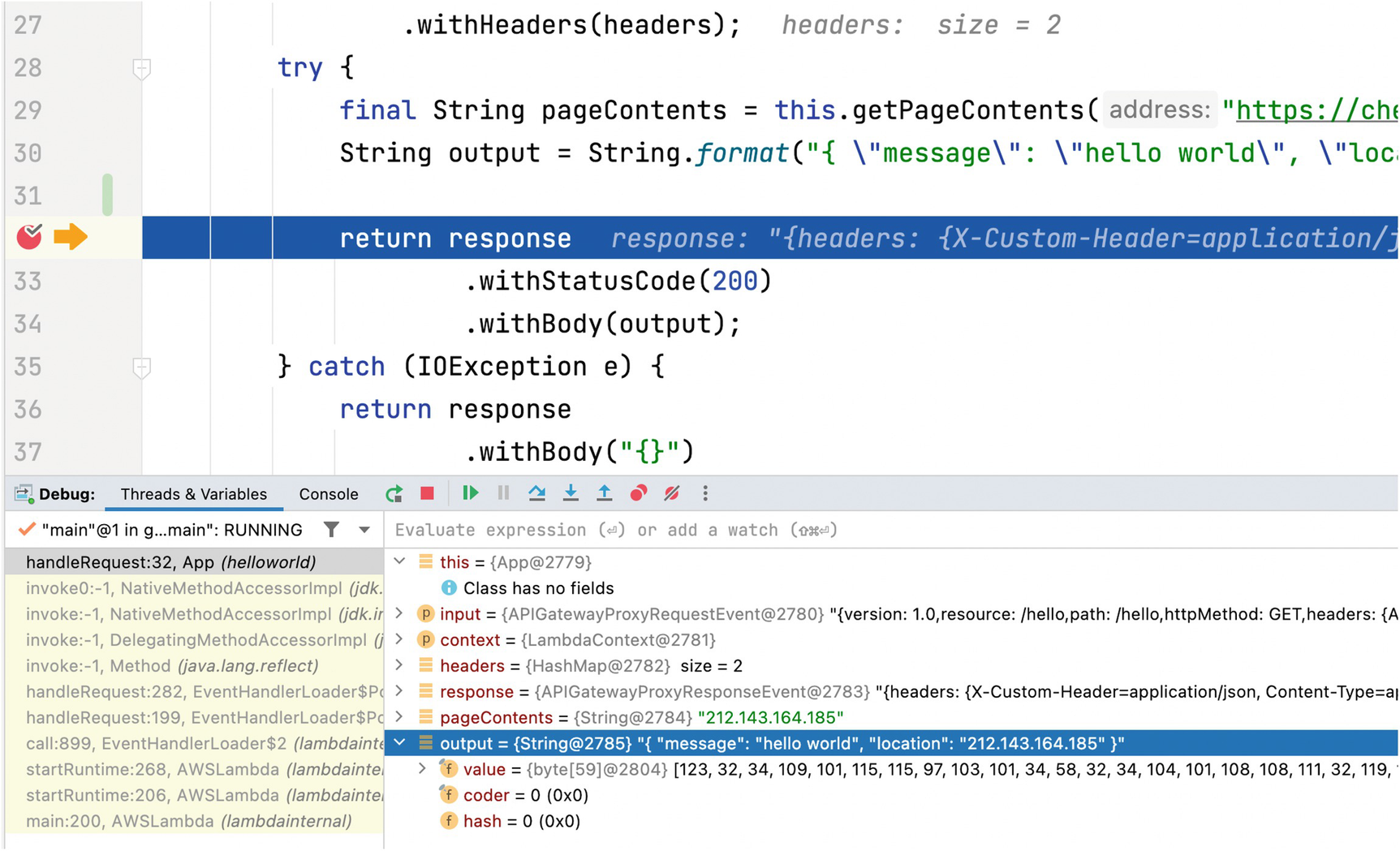 Not all runtimes and IDEs support this capability. To get this in IntelliJ/IDEA, we need to install a third-party plugin2. VS Code supports this only for some runtimes, such as C#, and at the time of this writing doesn’t support it for Node.js.