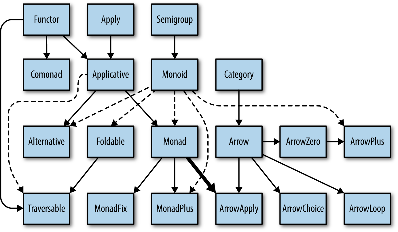 A public service announcement: monads (and their friends from Figures 11-1 and 11-2 and the previous paragraph) are at risk of being fetishized in a way that has been the case for design patterns, data structures, algorithms, and even math itself. Not knowing all of the trivia (let alone the deep mathematical basis) of monadic laws should not stop you from using useful objects and functions when you find them. “I’m not a math person” and a terribly architected website-producing company interviewing with “How do you reverse a linked list?” are evil twins.