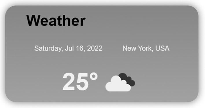 For the first demo, I’ve reworked an example by Simon O. available from GitHub – you can see the original version at https://github.com/FroyoNom/Svelte-Weather-Forecast. My version is cut down to only display the current weather, hardcodes the location to New York (Apress’ office!), and uses the luxon date library instead to provide the current date.
