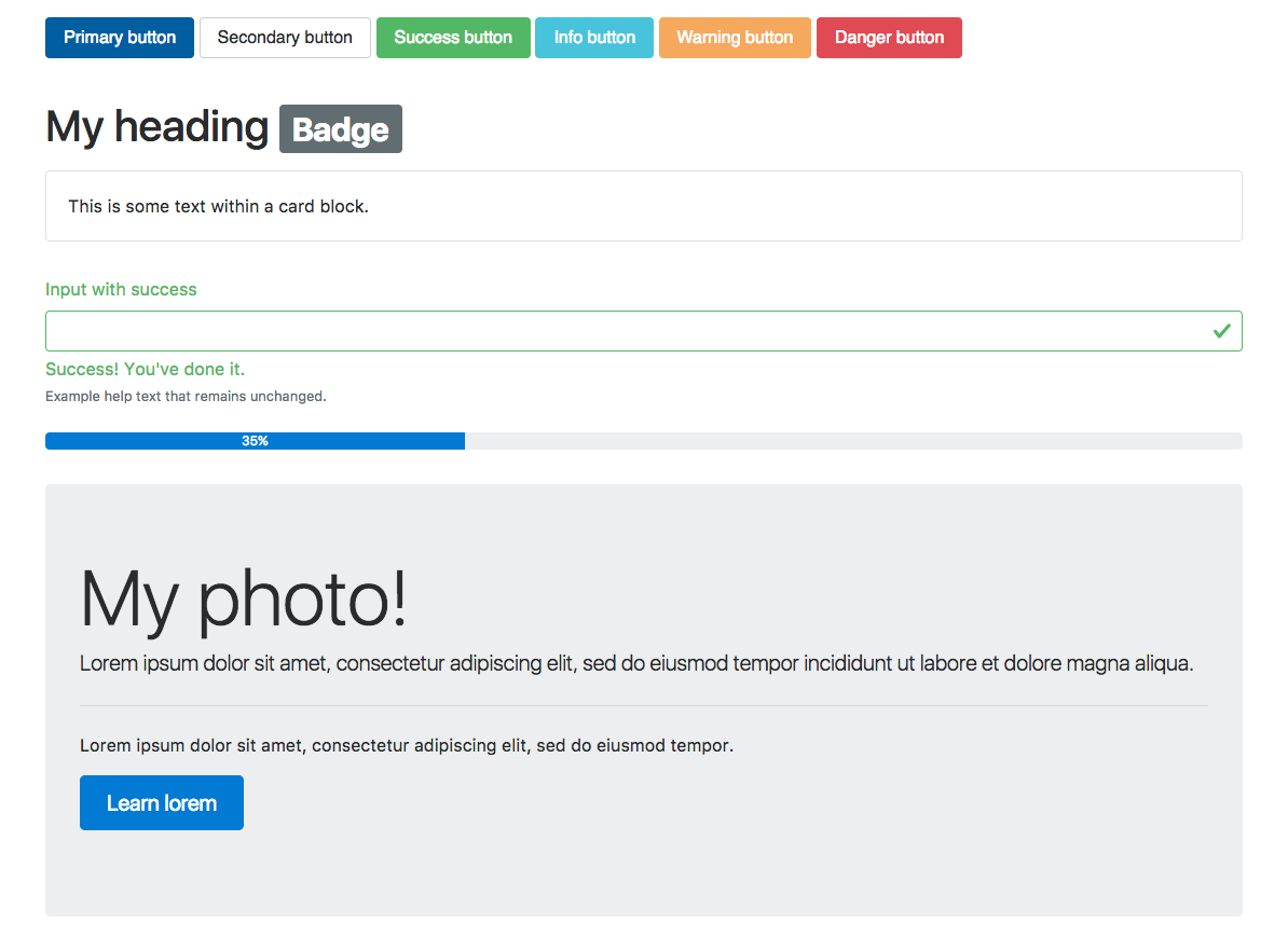Building on top of this clean slate, Bootstrap 4 provides a set of basic styles that allow you to effectively improve the general look and feel of the most commonly-used elements used to construct user interfaces. Examples of the elements that Bootstrap allows you to style are buttons (figure 1.2), input fields, headings (figure 1.3), paragraphs, special inline texts, figures, tables, and navigation controls.