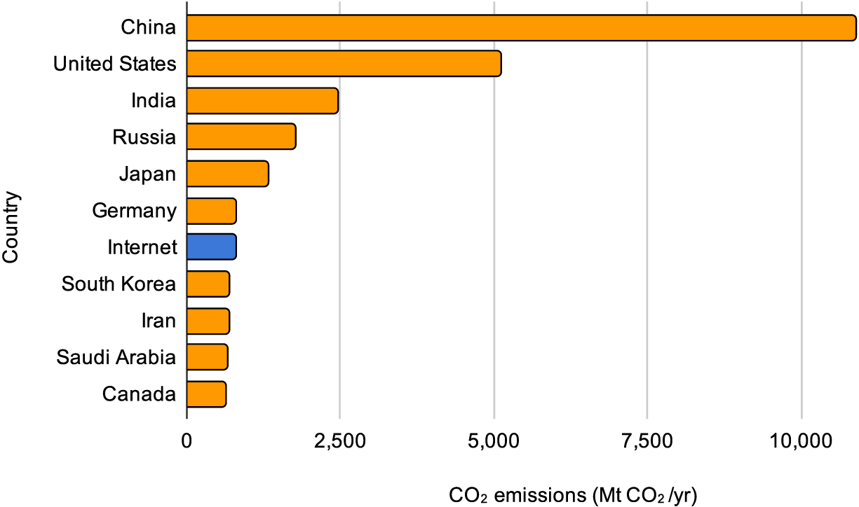 The enormous and complex system that makes it possible for you to read an email, visit a web page, search on Google, or watch the latest series of The Crown—acts which may involve your phone, computer, television, Wi-Fi routers, a local telecom network, global and national repeater stations, and data centers—uses electricity at every stage. If the internet were a country, it would be the sixth most polluting country in the world, with annual emissions similar to those of Germany (Fig 1.1) (http://bkaprt.com/swd/01-01/).
