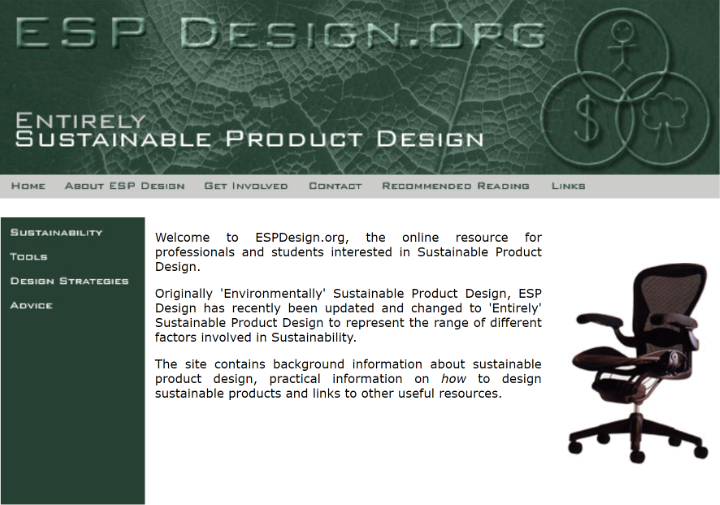 Thirty years later, as an environmentally minded teenager studying product design at university, I was inspired by Papanek’s work. I was passionate about pursuing a career in product design, but only if I could also be a part of the solution to the environmental crisis. I chose sustainable design as my thesis topic and spent my final year researching every tool, technique, book, regulation, and case study of sustainable product design. Keen to inspire other designers to pursue sustainable practices, I put all of this information on a website in the first online guide to sustainable product design (Fig 0.1). At a time when “product design” almost exclusively referred to the design and engineering of physical products and services, that website was one of my first steps into the digital world.