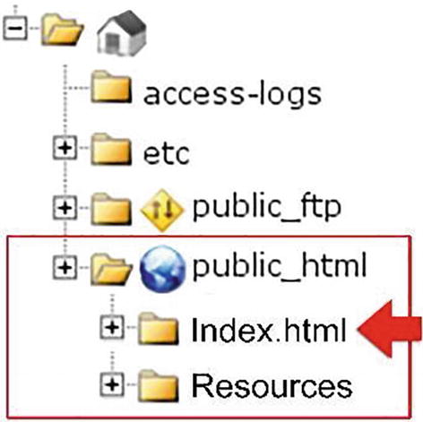 A screenshot of the folders root. The folders are access-logs, e t c, public f t p, public h t m l, index dot h t m l, and resources. The folders public h t m l, index dot h t m l, and resources highlight with a rectangular box, and a left arrow points to the index dot h t m l folder.