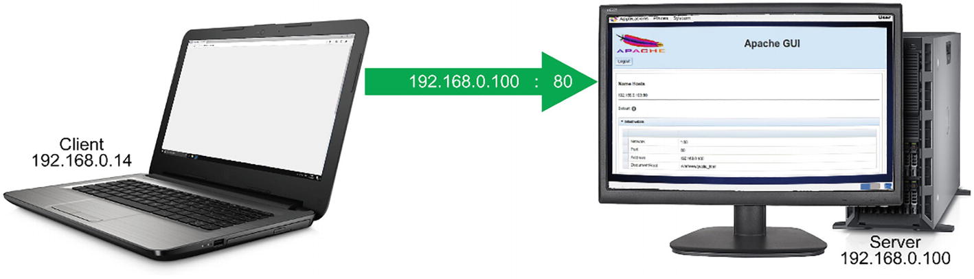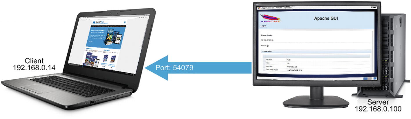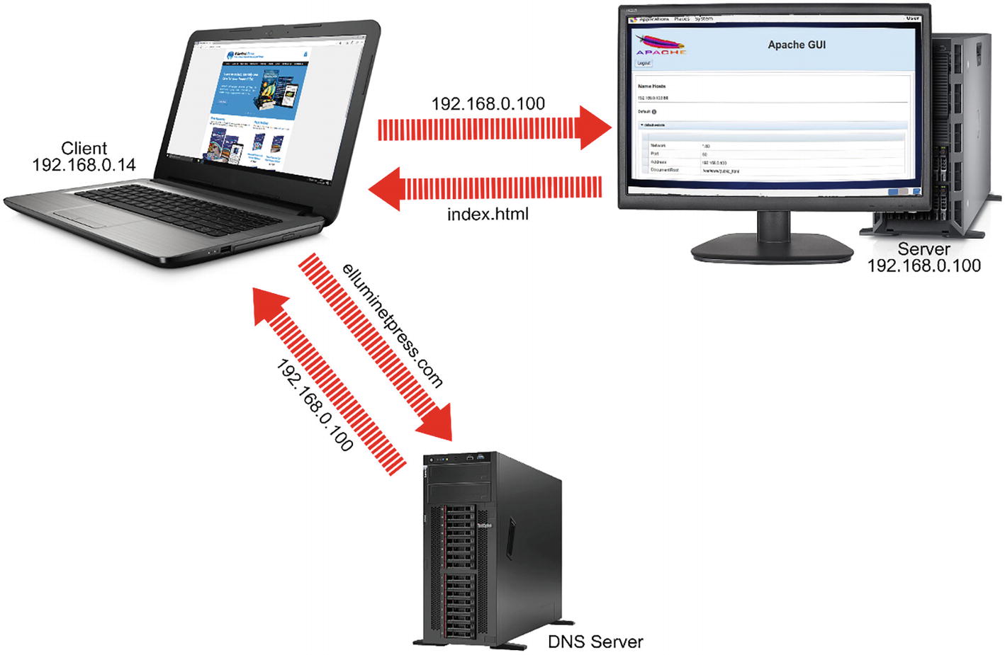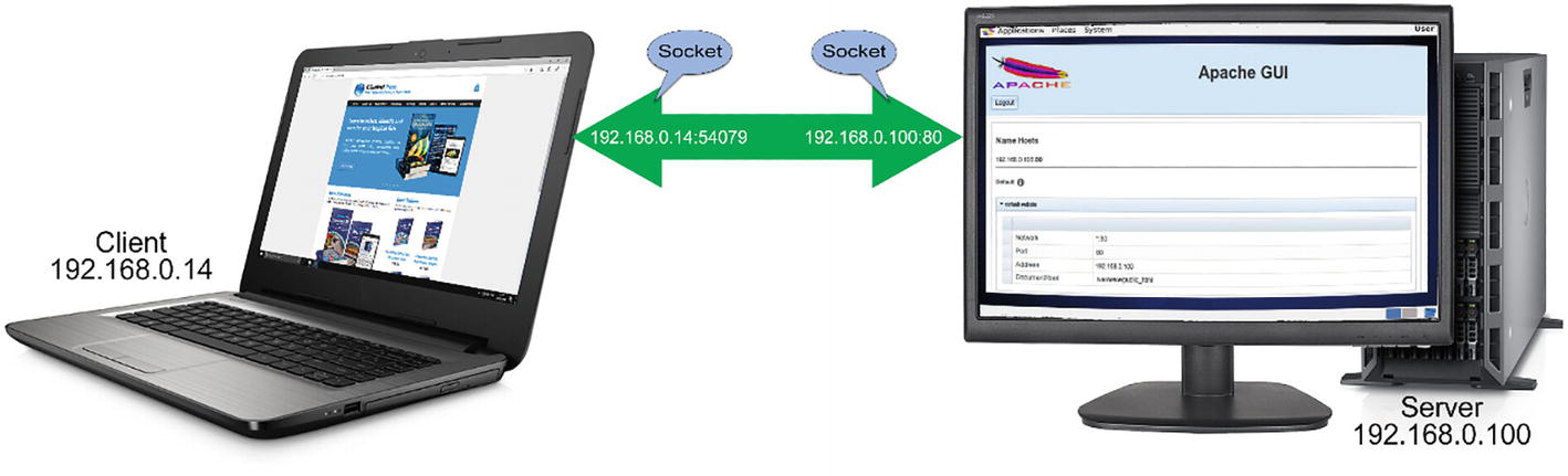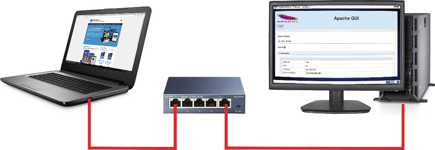 A schematic illustration depicts the link between a web server and the C P U of a machine. A desktop exhibits Apache G U I page.