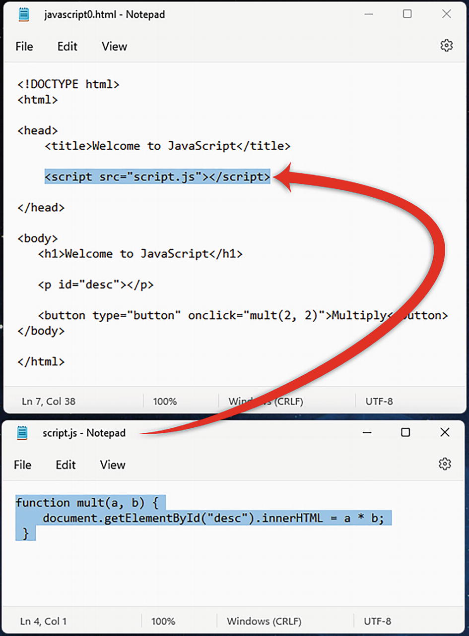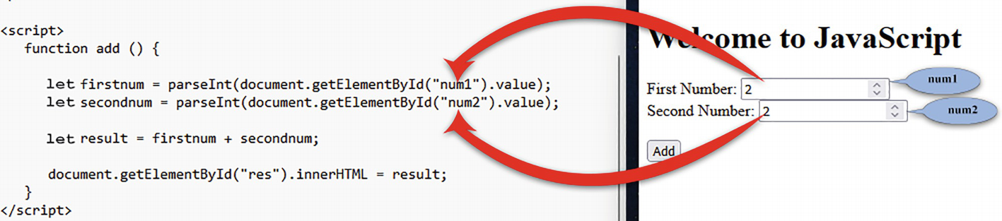 A screenshot represents a code on the left and its compilation on the right. The compilation part represents a form to enter the first and second numbers. The arrows indicate the function to add between the script tag of the code.