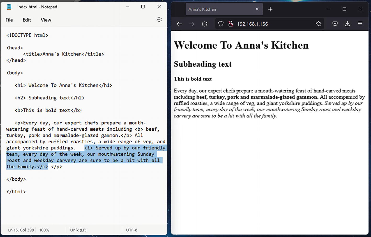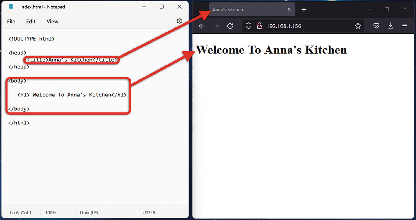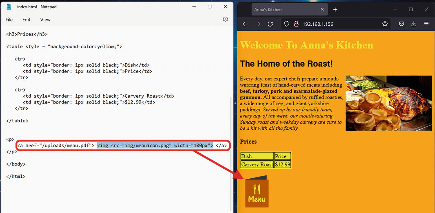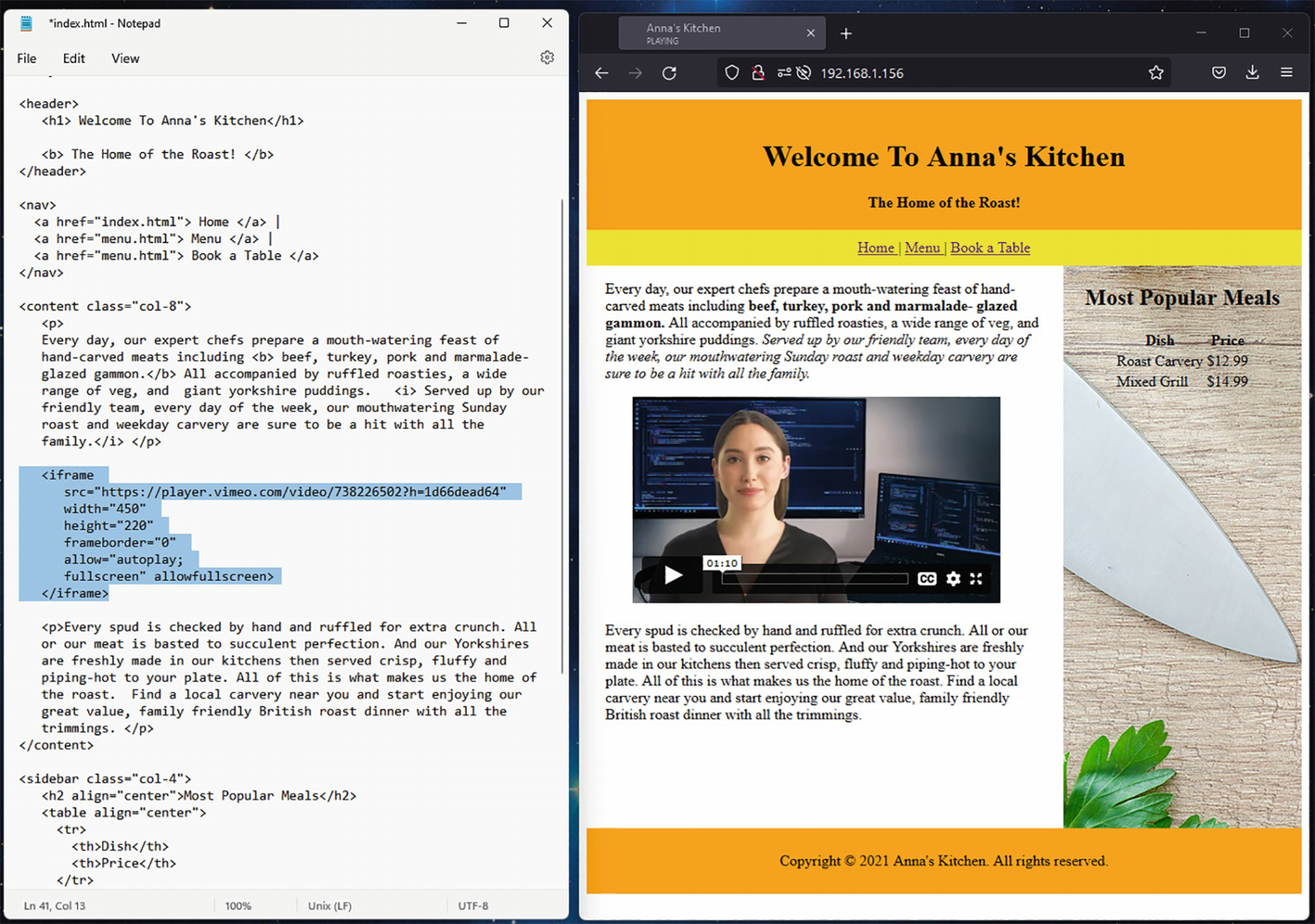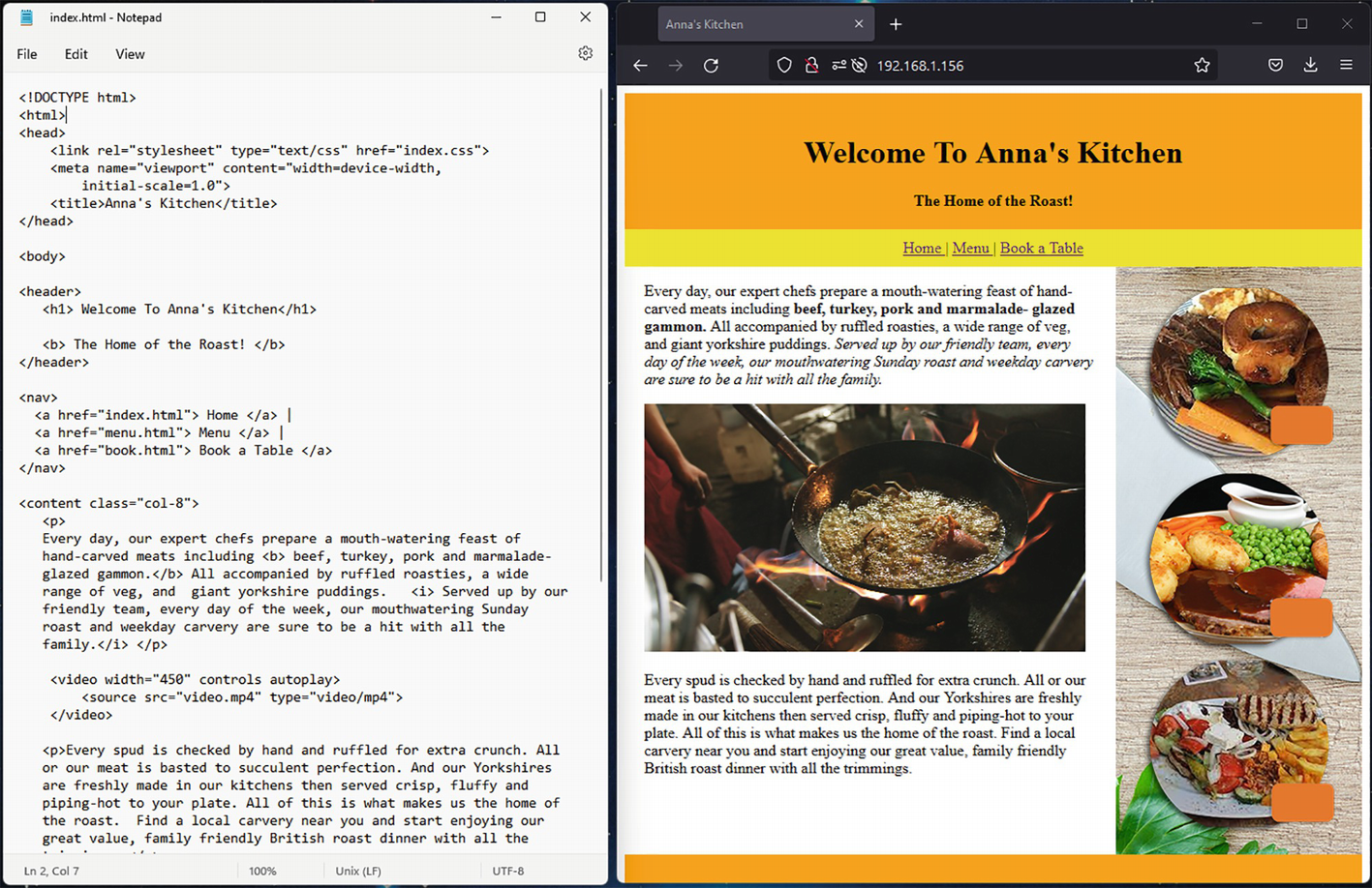 Two screenshots of the index dot h t m l-Notepad and webpage screens. The 24-line code is on the Notepad screen. The Welcome to Annas Kitchen webpage is on the Annas Kitchen website.