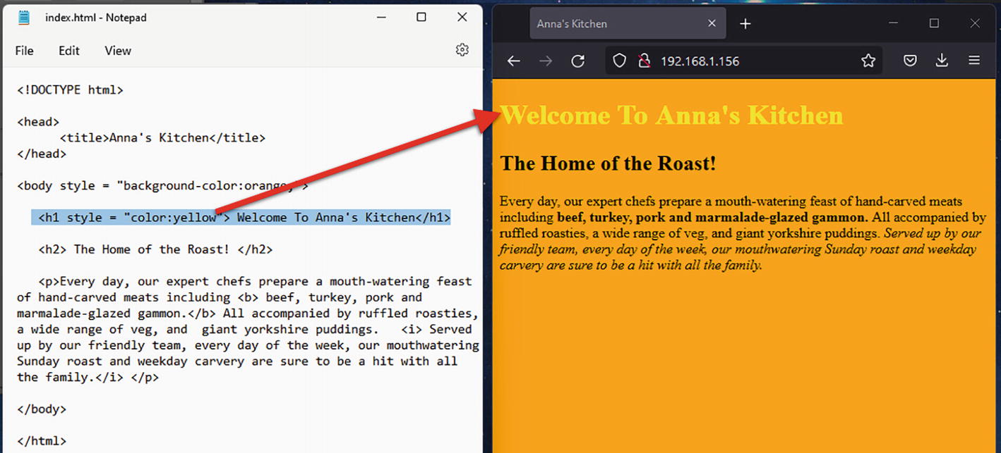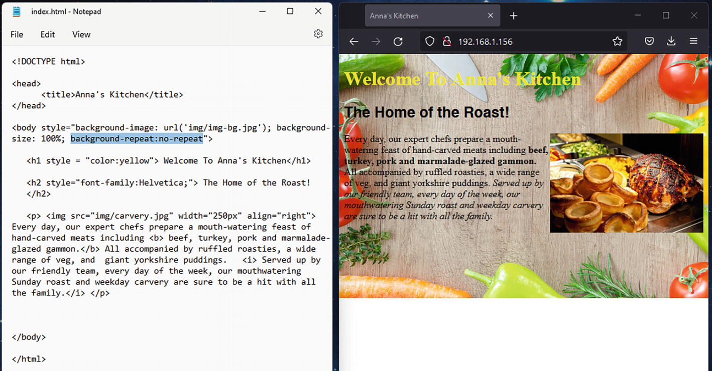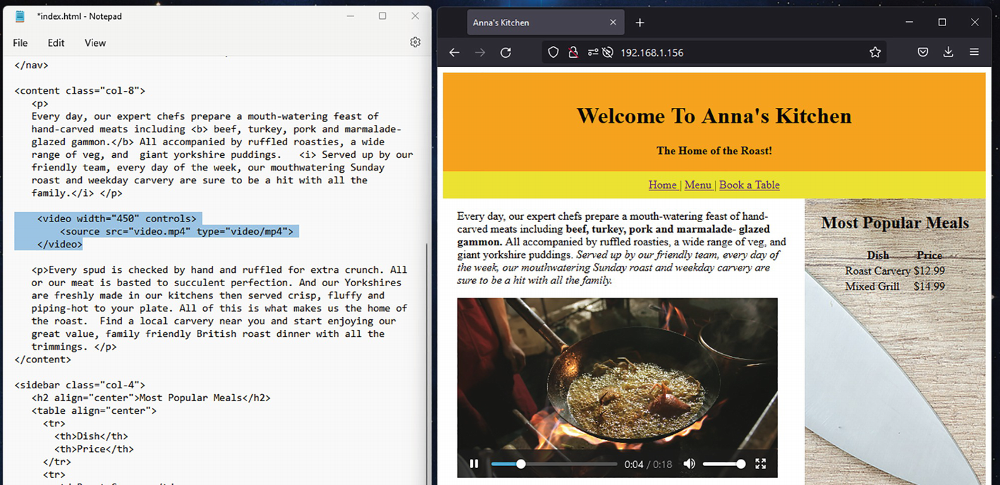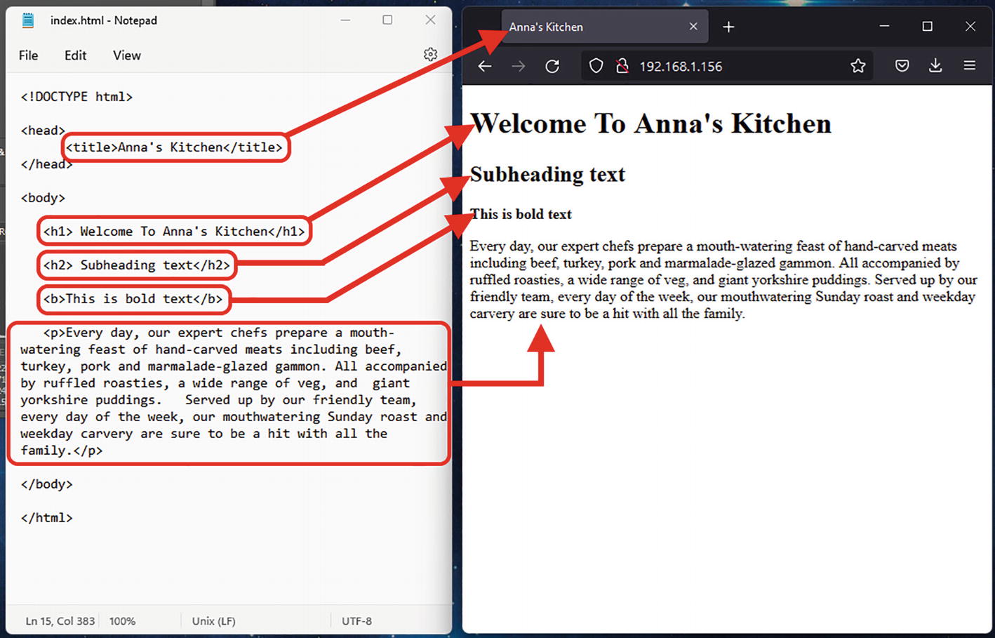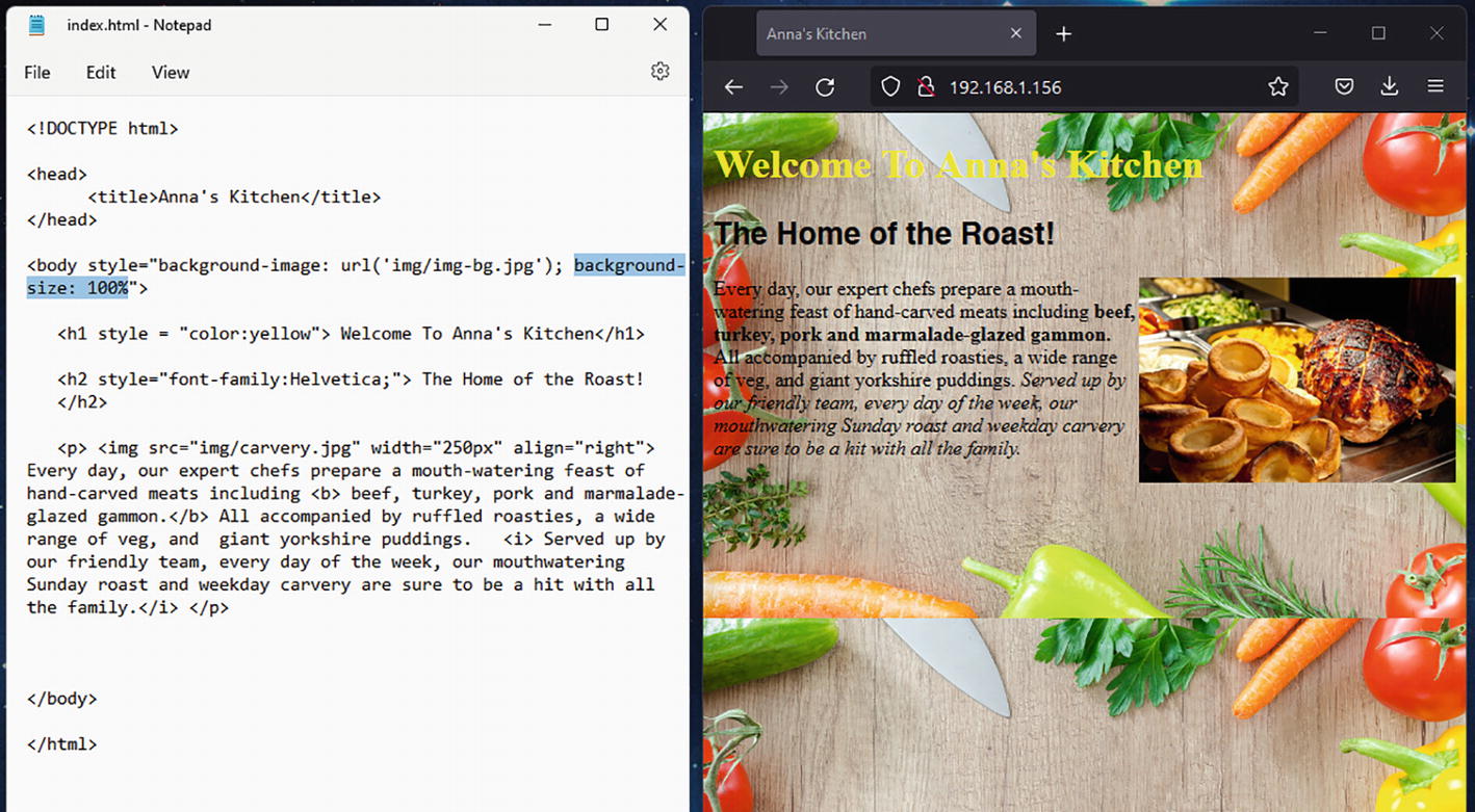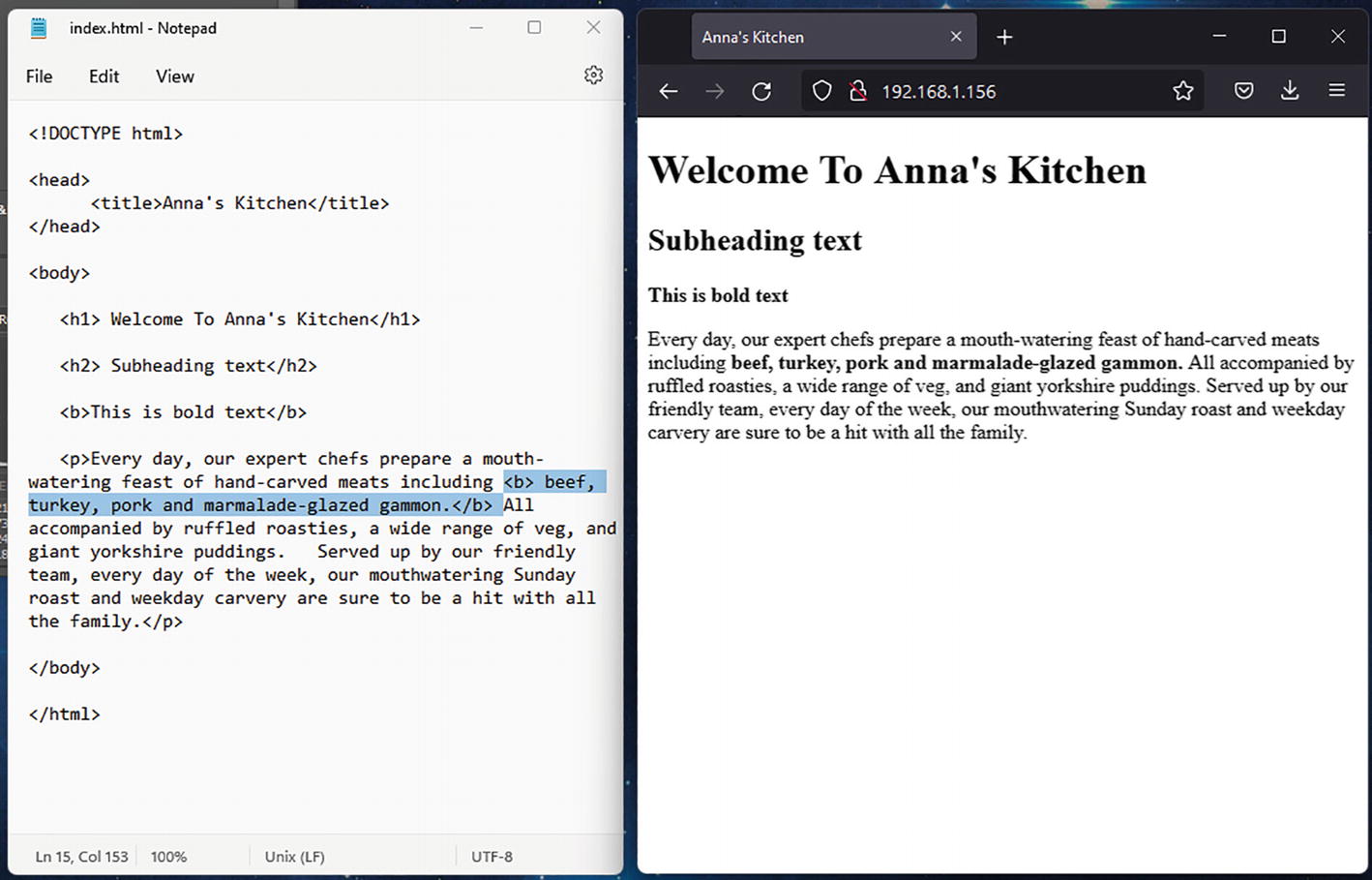 Two screenshots of the index dot h t m l-Notepad and webpage screens. The 24-line code is on the Notepad screen. The Welcome to Annas Kitchen webpage is on the Annas Kitchen website.