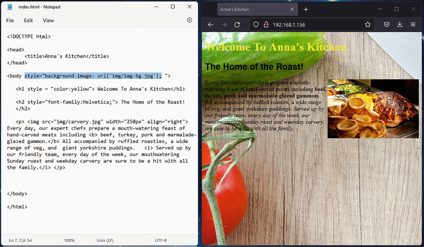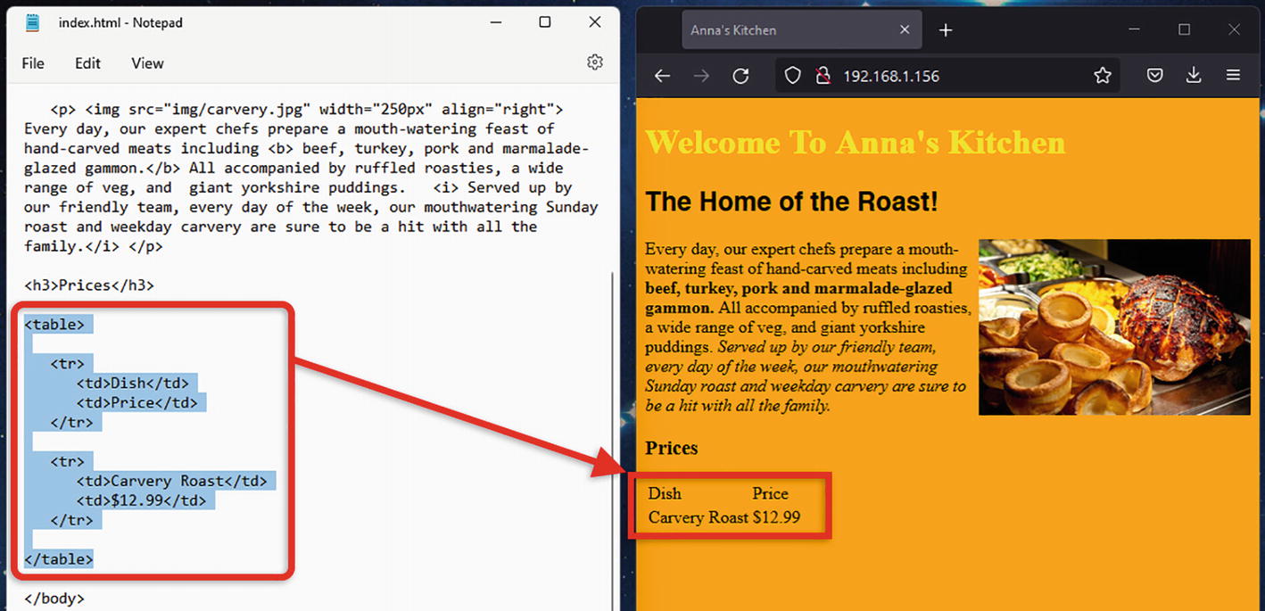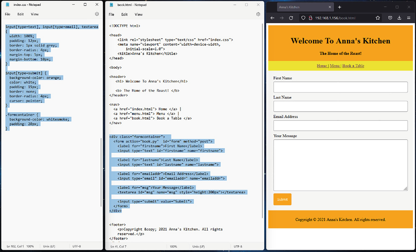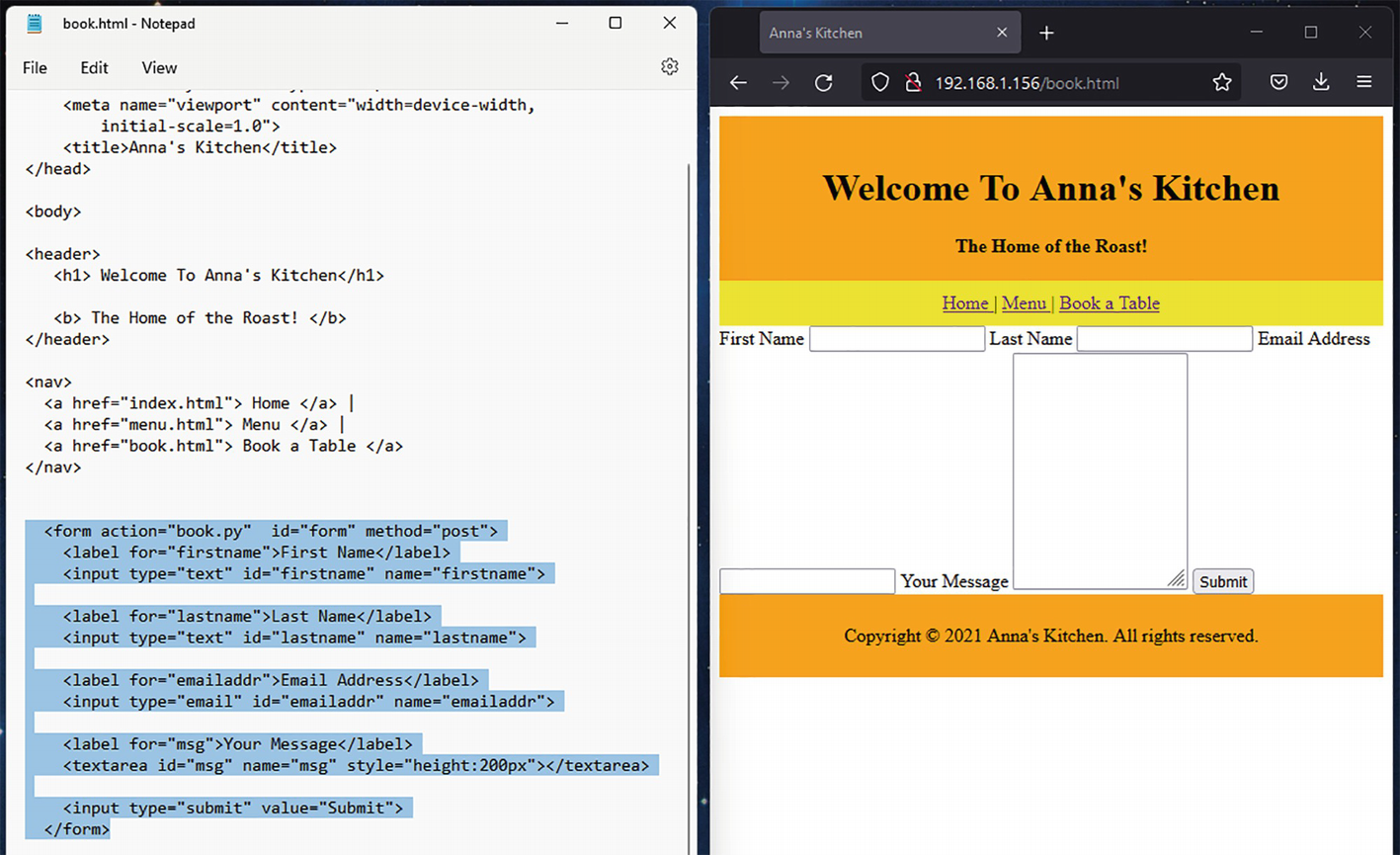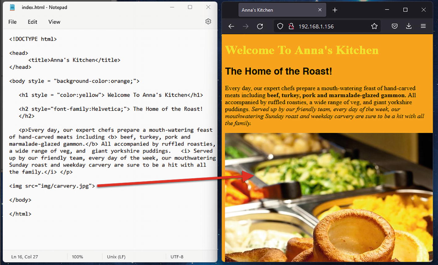 Two screenshots of the index dot h t m l-Notepad and webpage screens. The 24-line code is on the Notepad screen. The Welcome to Annas Kitchen webpage is on the Annas Kitchen website.