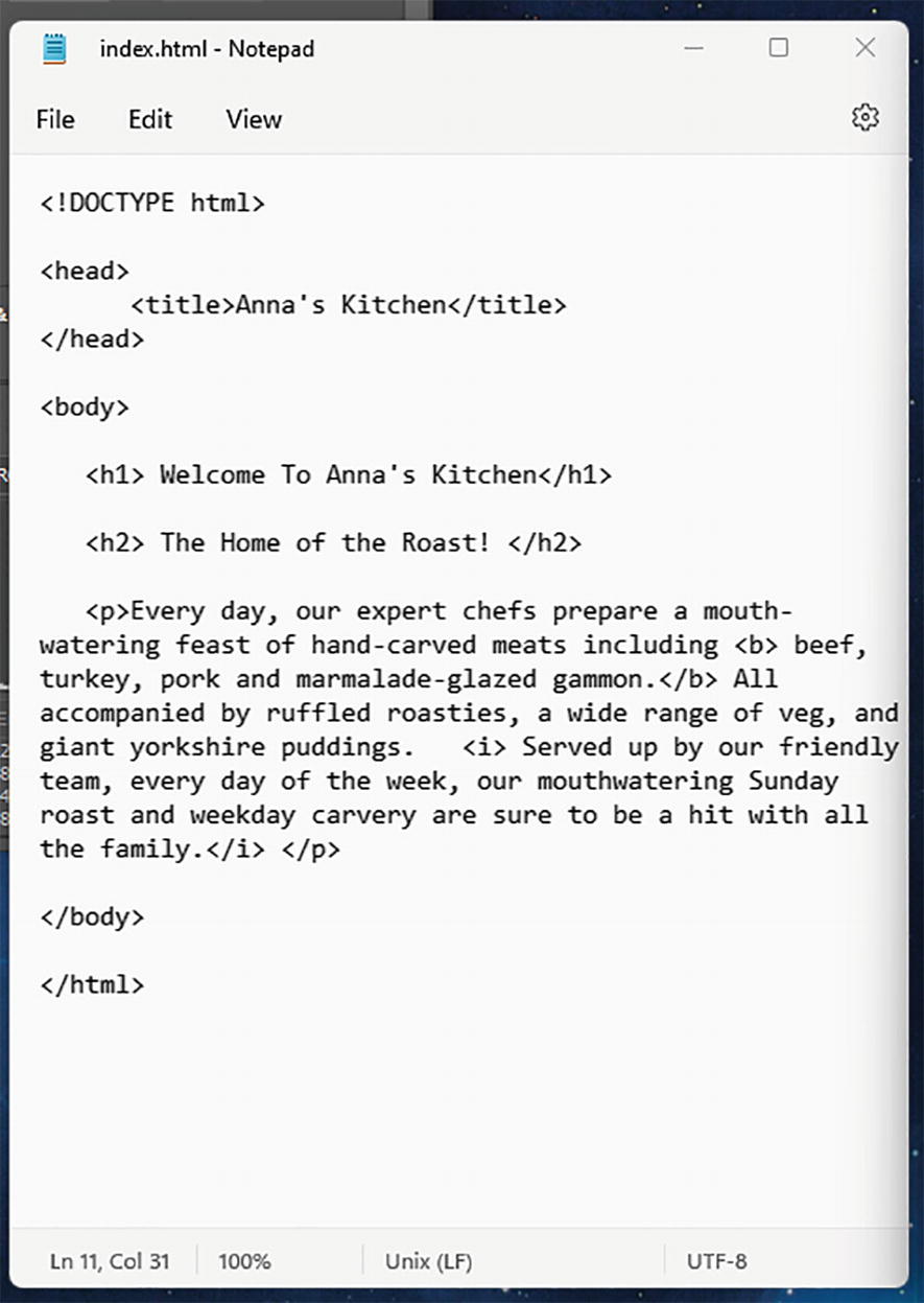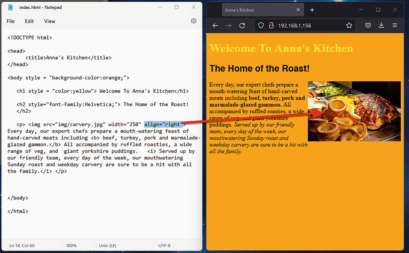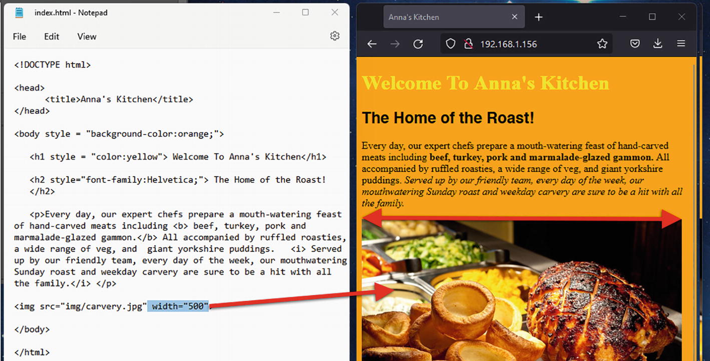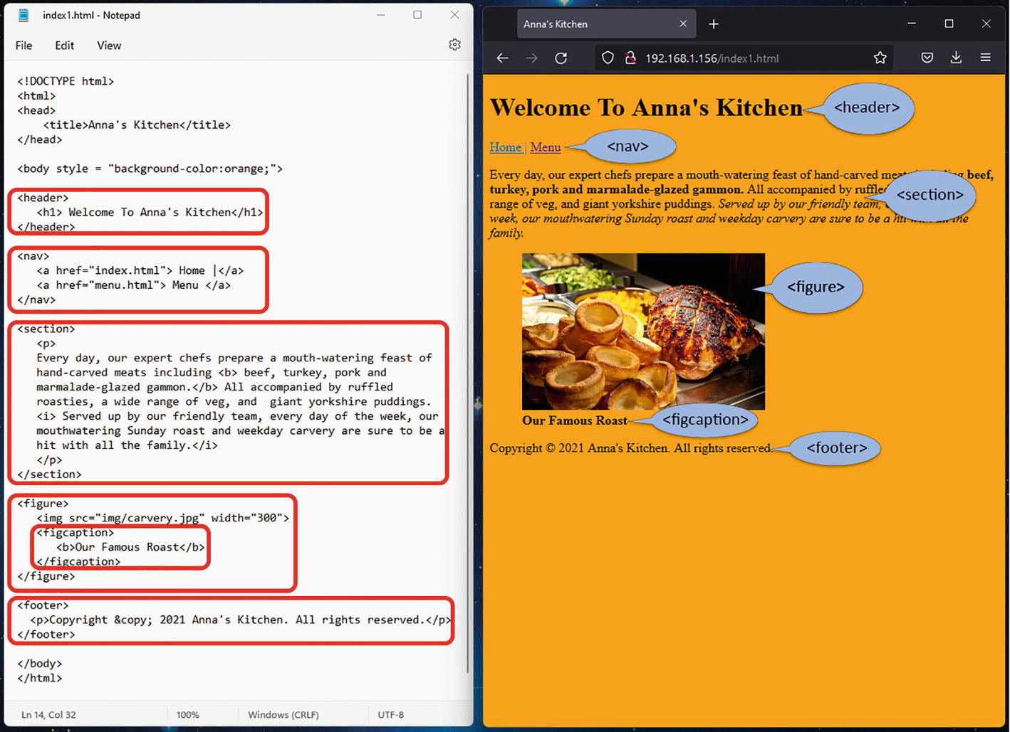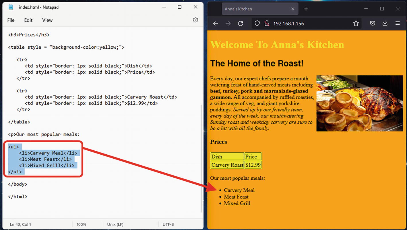 Two screenshots of the index dot h t m l-Notepad and webpage screens. The 24-line code is on the Notepad screen. The Welcome to Annas Kitchen webpage is on the Annas Kitchen website.