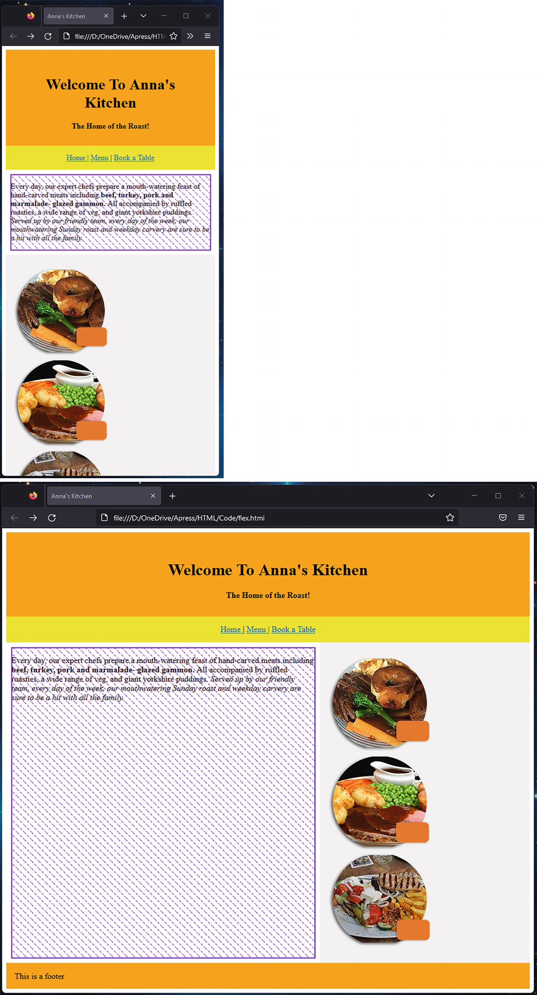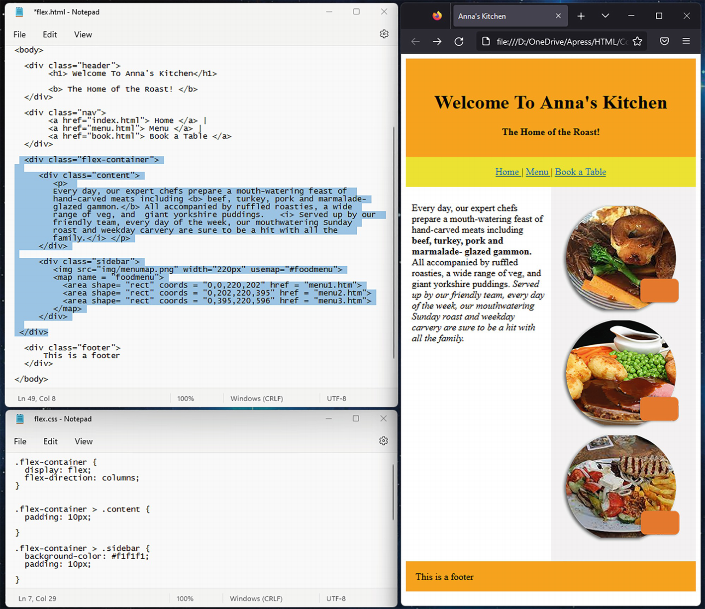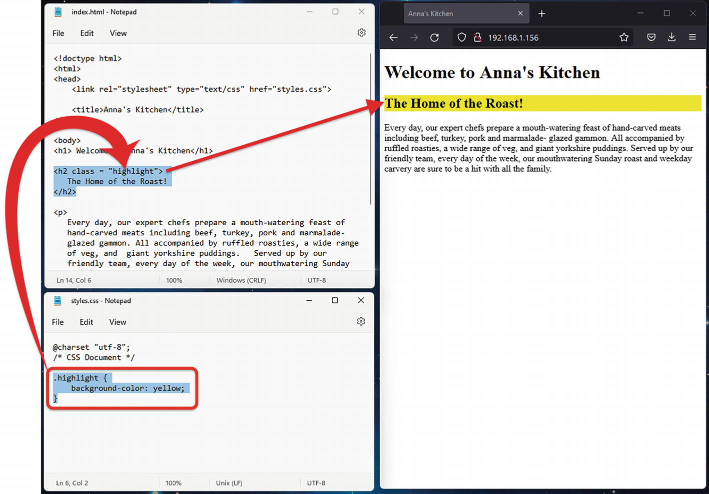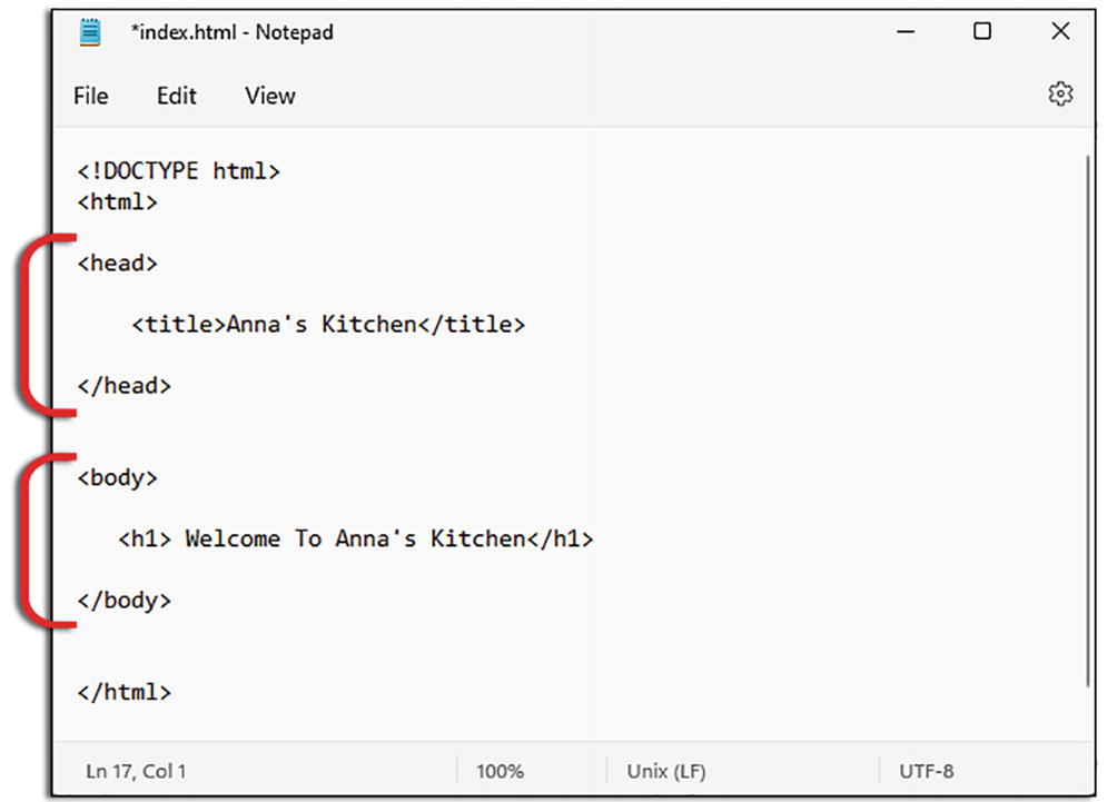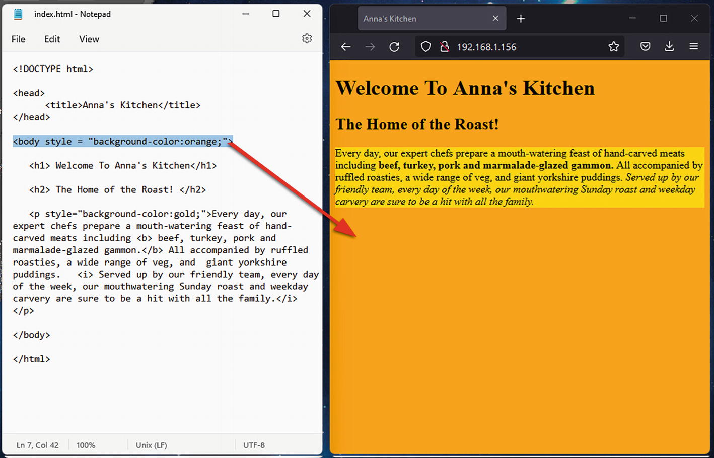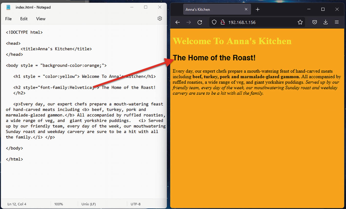 Two screenshots of the index dot h t m l-Notepad and webpage screens. The 24-line code is on the Notepad screen. The Welcome to Annas Kitchen webpage is on the Annas Kitchen website.