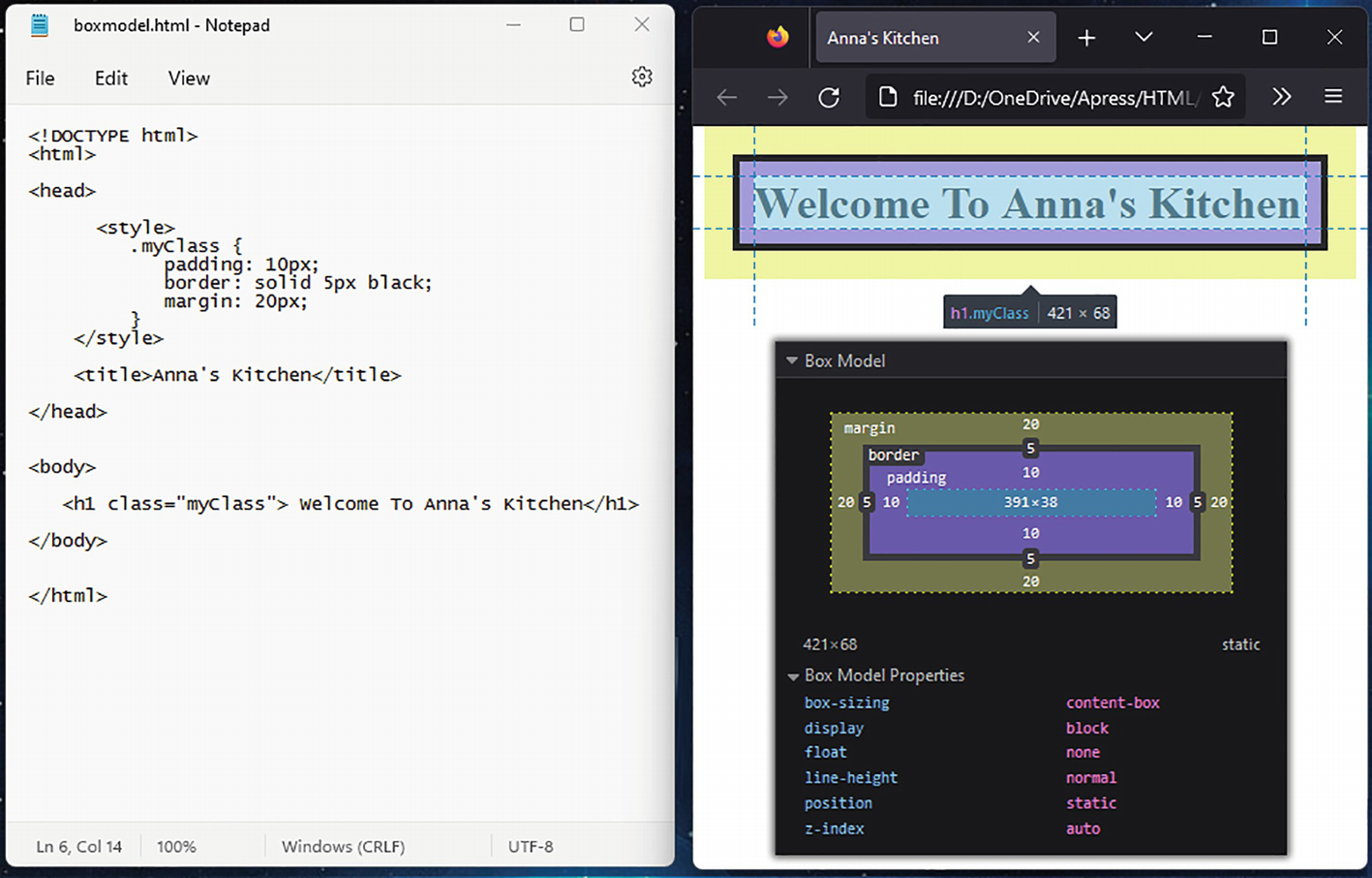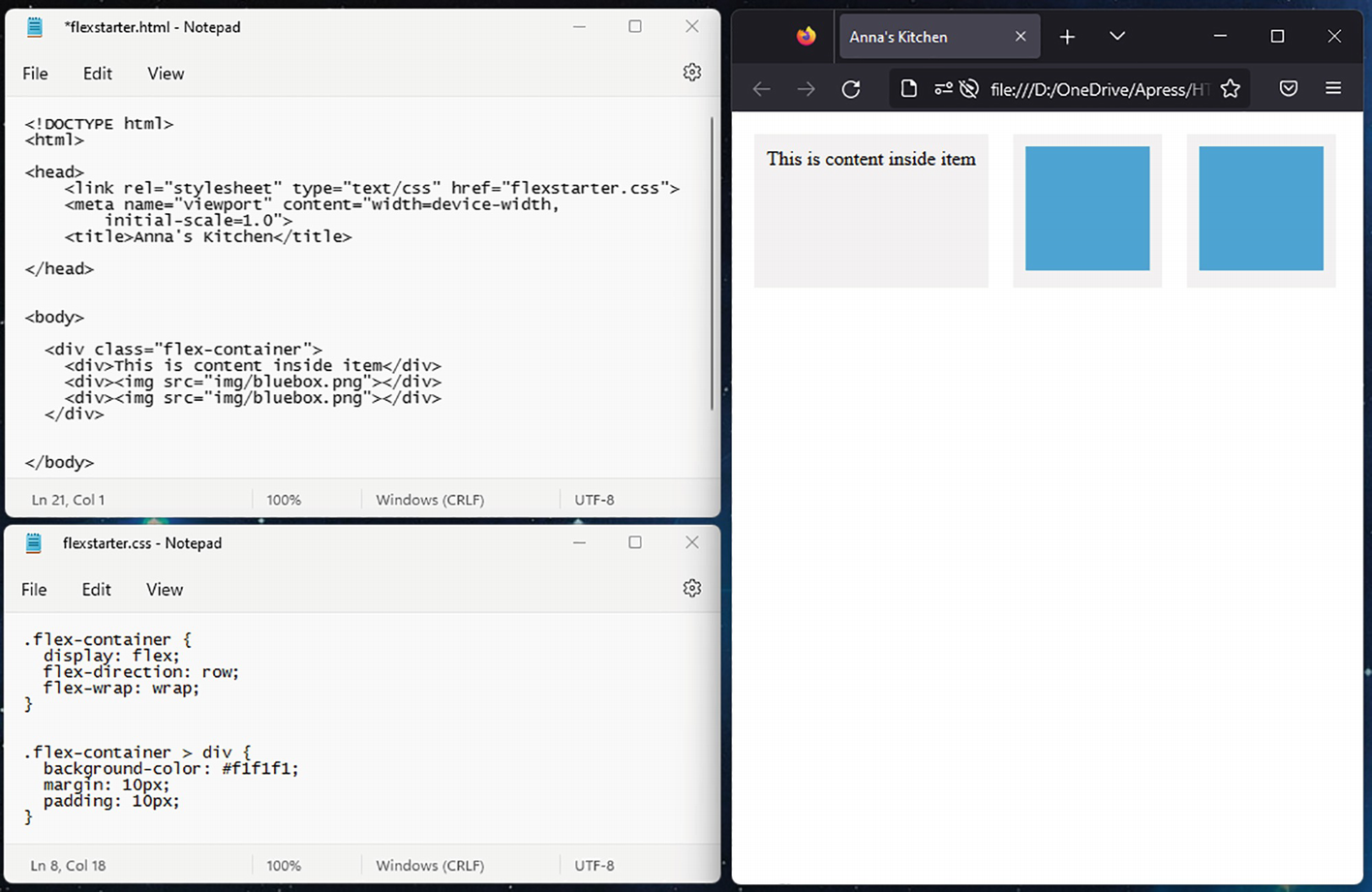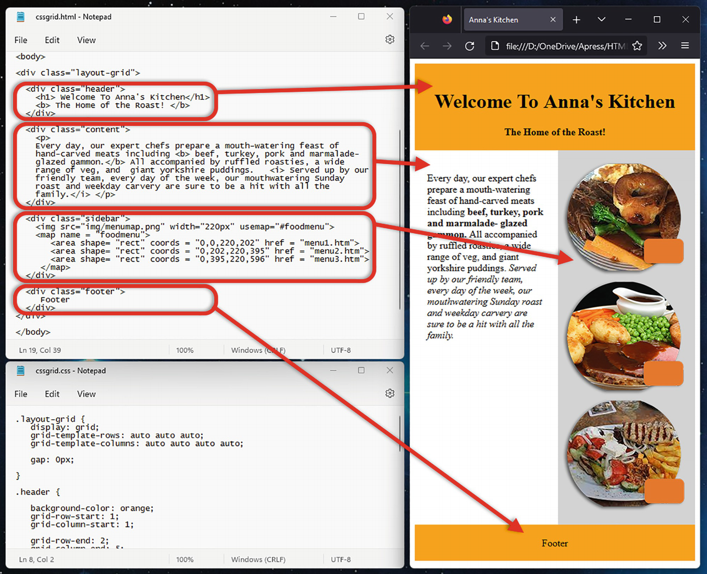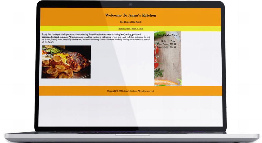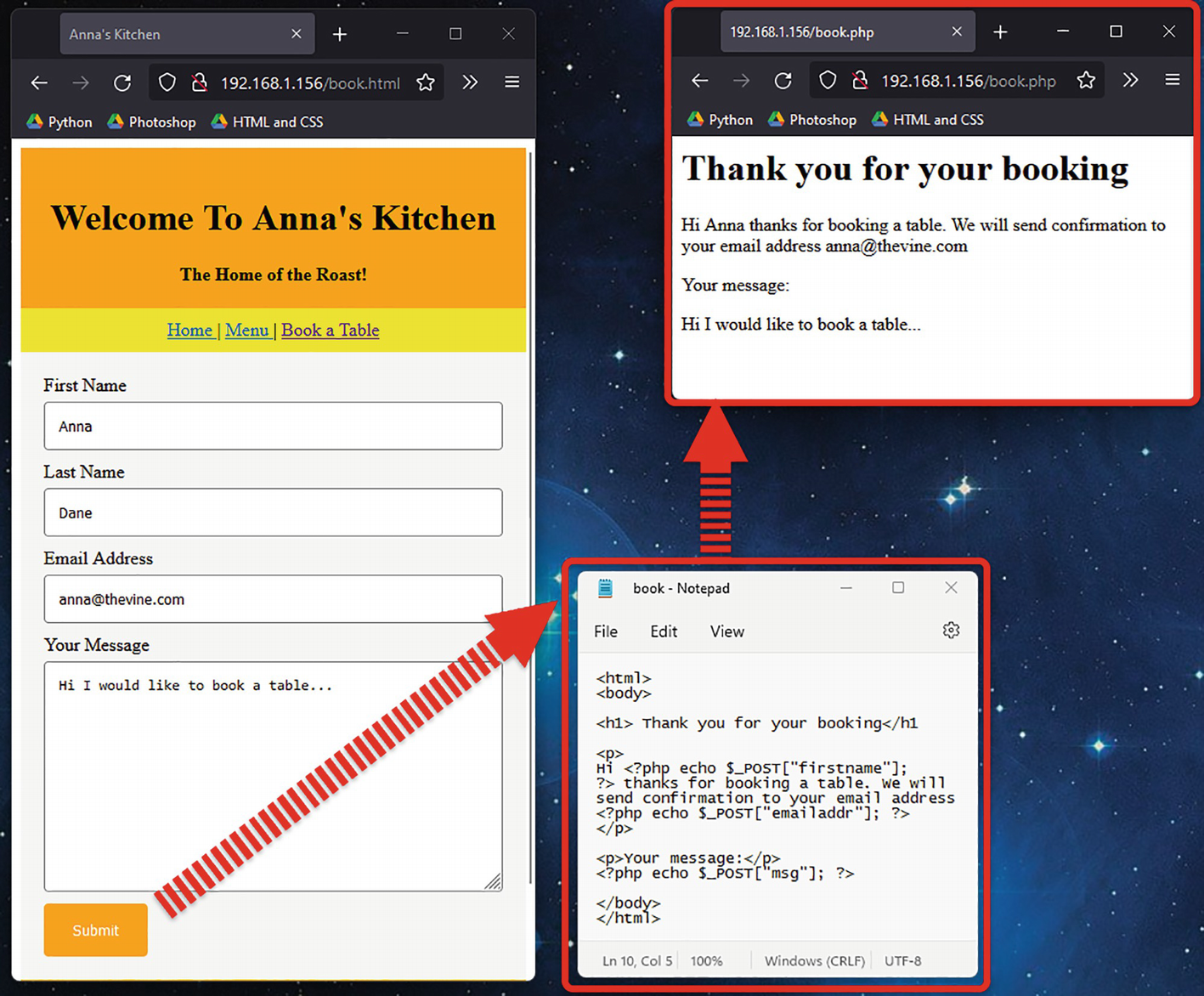 Two screenshots of the index dot h t m l-Notepad and webpage screens. The 24-line code is on the Notepad screen. The Welcome to Annas Kitchen webpage is on the Annas Kitchen website.