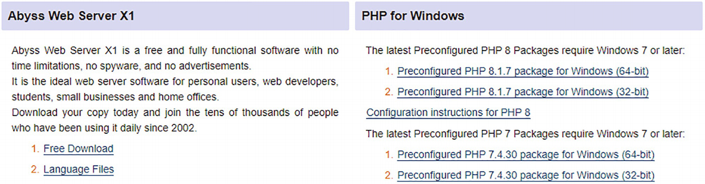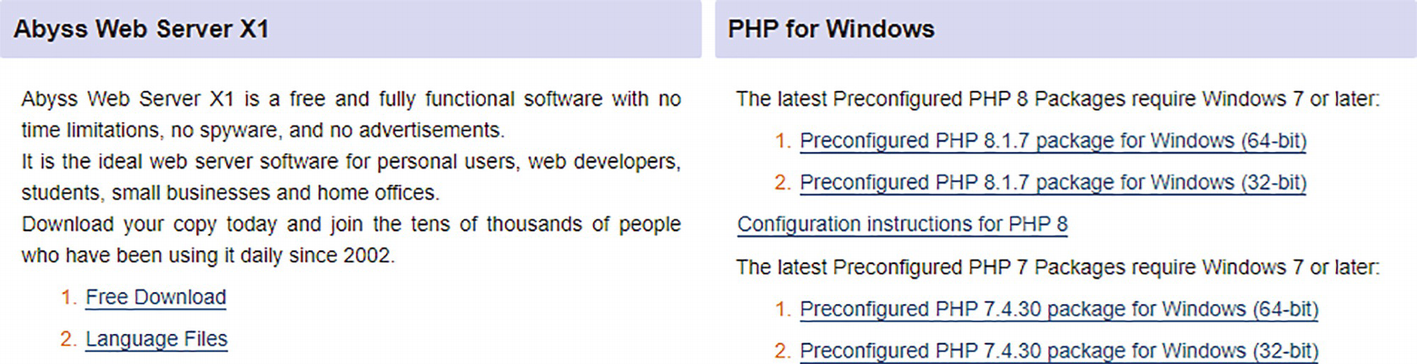 An illustration of 2 cropped screenshots of Abyss web server X 1 and P H P for windows. Both pages include the details and links to download and language files.