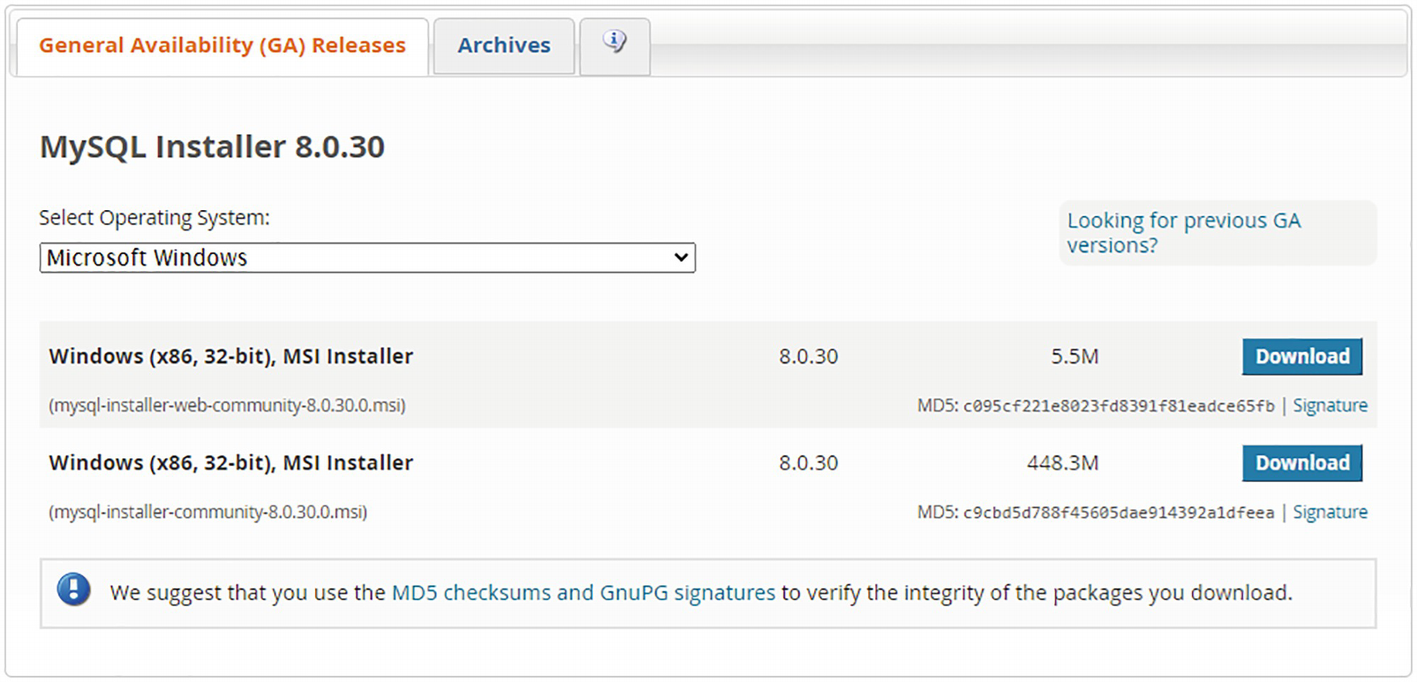 You can download MySQL from mysql.com/downloads/windows/installer/.
