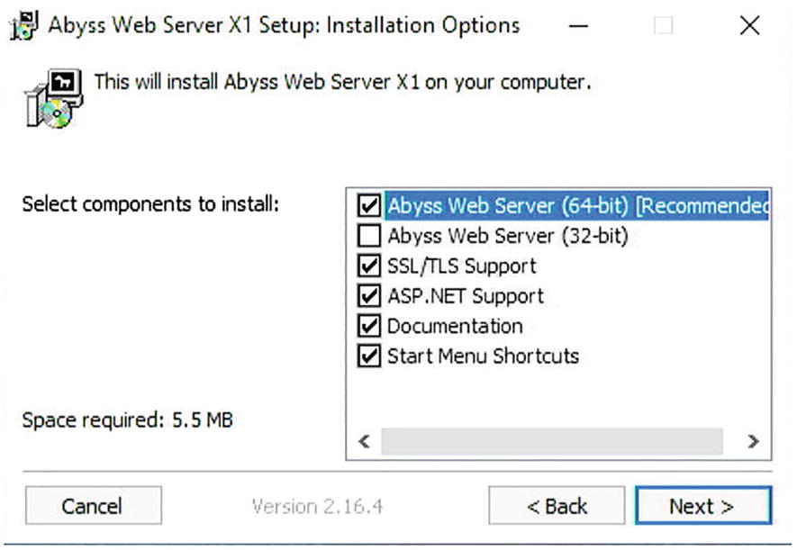 A screenshot of the Abyss Web Server X 1 setup and installation option. The components to install list various components and highlights the Abyss web server 64-bit options. The cancel, back, and next buttons are at the bottom, where the next button highlights with a dark shade.