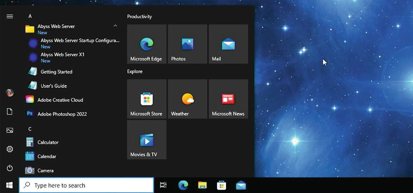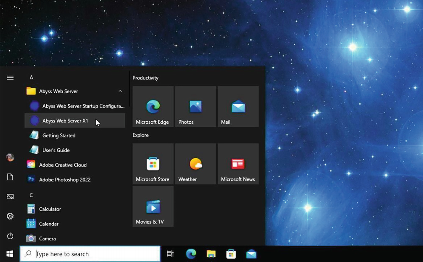 A screenshot displays the Windows screen of the computer. The menu lists Abyss web server, adobe creative cloud, adobe photoshop, calculator, calendar, camera, productivity, and explore. The Abyss web server X 1 option highlights with a light shade. The power button, settings, image, and notepad icons are on the left.
