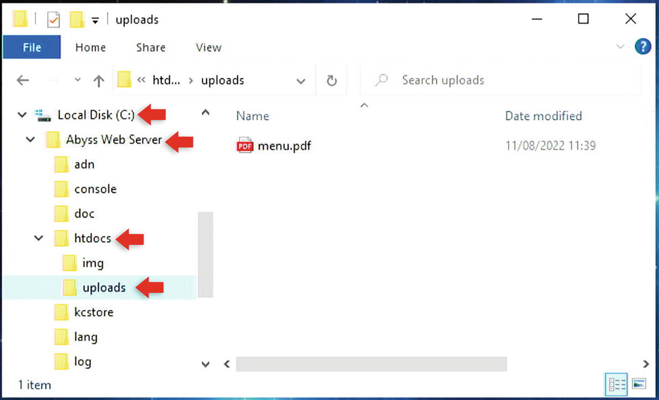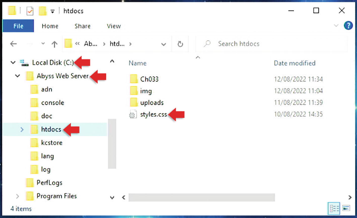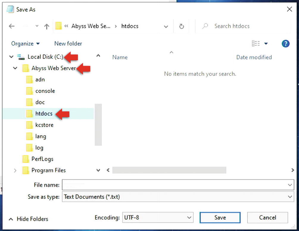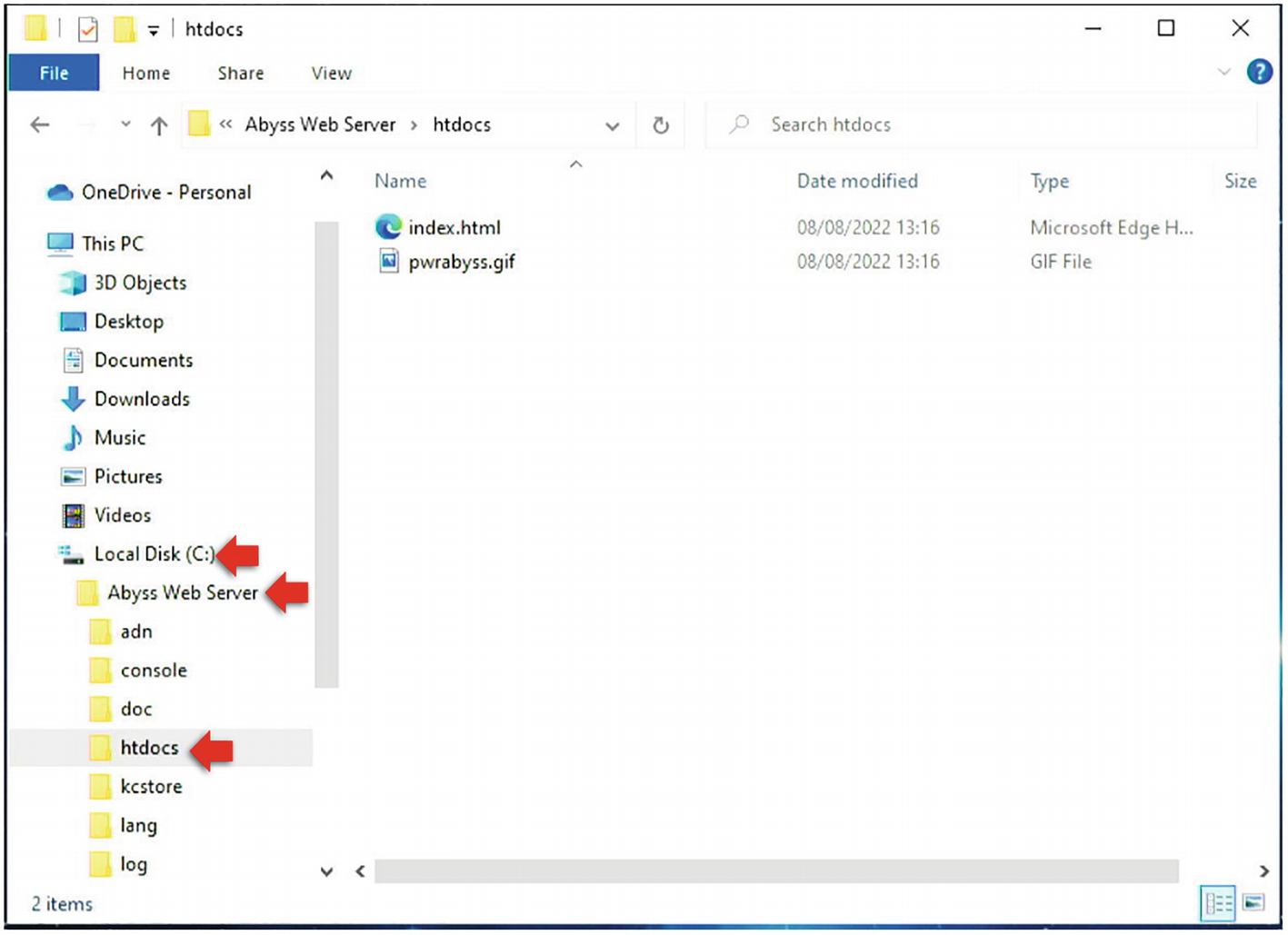 A screenshot of the h t docs in file explorer. The menu bar has 4 options, file, home, share, and view are at the top. The file option has the name, date modified, type, and size of 2 documents. Local disk c, Abyss web server, h t docs option on the left are points with left arrows.
