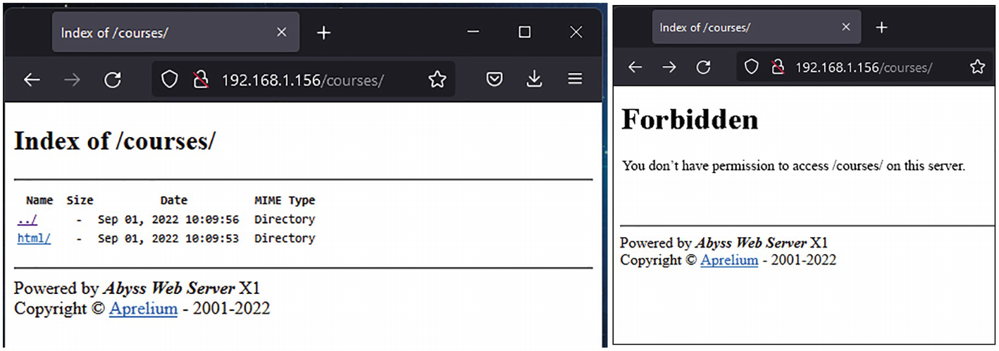 Two webpage screenshots of the index of courses. 1. The screen reads an index of courses and a name, size, date, and mime type. 2. The screen reads forbidden, and you dont have permission to access, courses on this server. Both screenshots has 2 line text at the bottom. Powered by abyss web server X 1, copyright Aprelium 2001 to 2022.