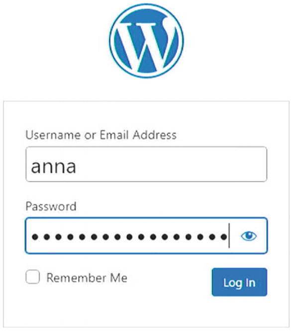 A screenshot of the login page of WordPress. The screen indicates the fields to enter the username and password. The button to log in is at the bottom and is selected.