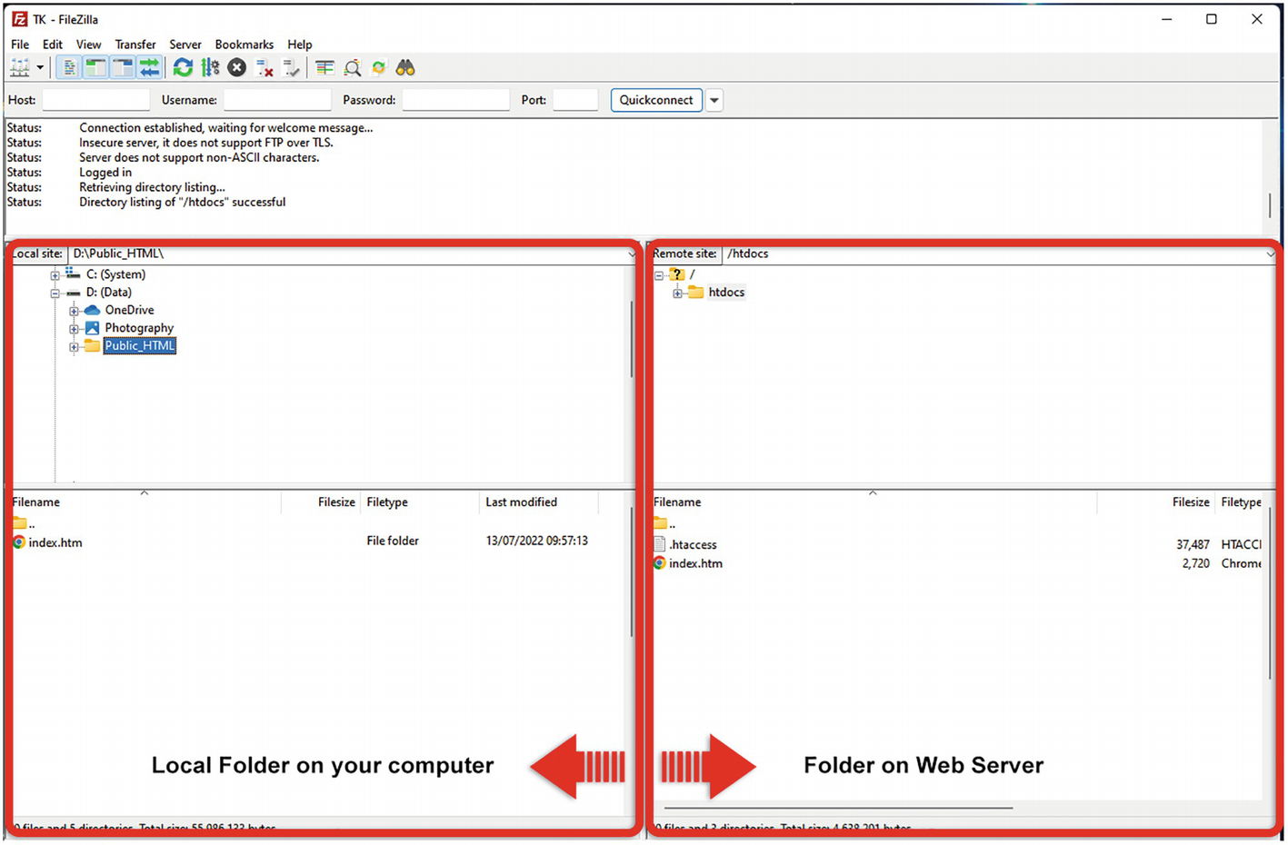 A screenshot of the T K-FileZilla. The screen includes a menu bar, toolbar, and main screen. The main screen highlights the local and remote sites. The local site has a public h t m l folder and the text at the bottom reads the local folder on your computer. The remote site reads folder on web server.