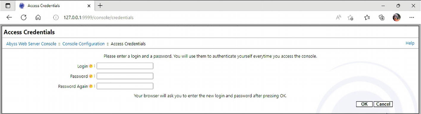 A screenshot of the access credentials webpage. The options for Abyss Web Server, console configuration, and access credentials are at the top. It includes the text box to enter login, password, and password again. The ok and cancel buttons are at the bottom.