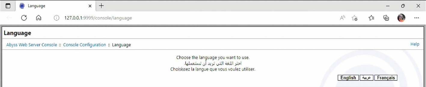 A screenshot of the language webpage. The options for Abyss Web Server, console configuration, and language are at the top. The options to choose English or Francais are at the bottom.