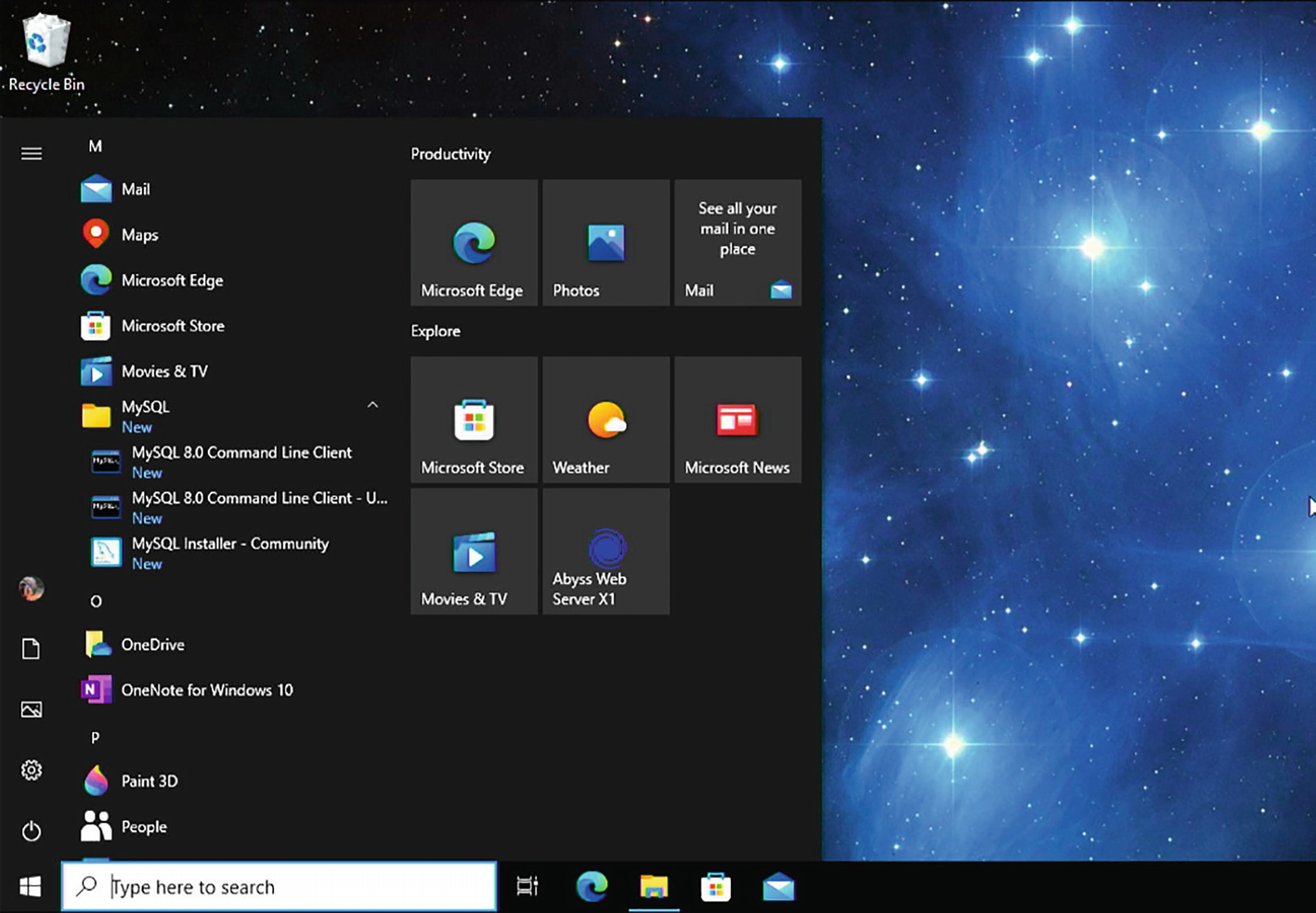 A screenshot exhibits the Windows start menu screen on the computer. It enlists a set of applications including My S Q L 8.0 command line client.