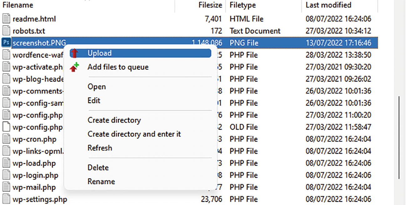 A screenshot of the upload and download files list. It lists the file name, size, type, and last modified. The file name screenshot dot P N G selects and has popup options. The popup menu includes upload, add files to queue, open, edit, create directory, create directory and enter it, refresh, delete, and rename.
