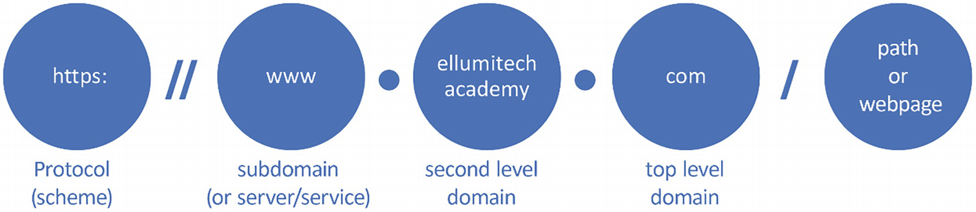 An illustration of the U R L structure illustrates as follows. Protocol h t t p s. Two forward slashes. Subdomain, w w w. Dot. Second level domain, ellumitech academy. Dot. Top-level domain, com. Forward slash. Path or web page