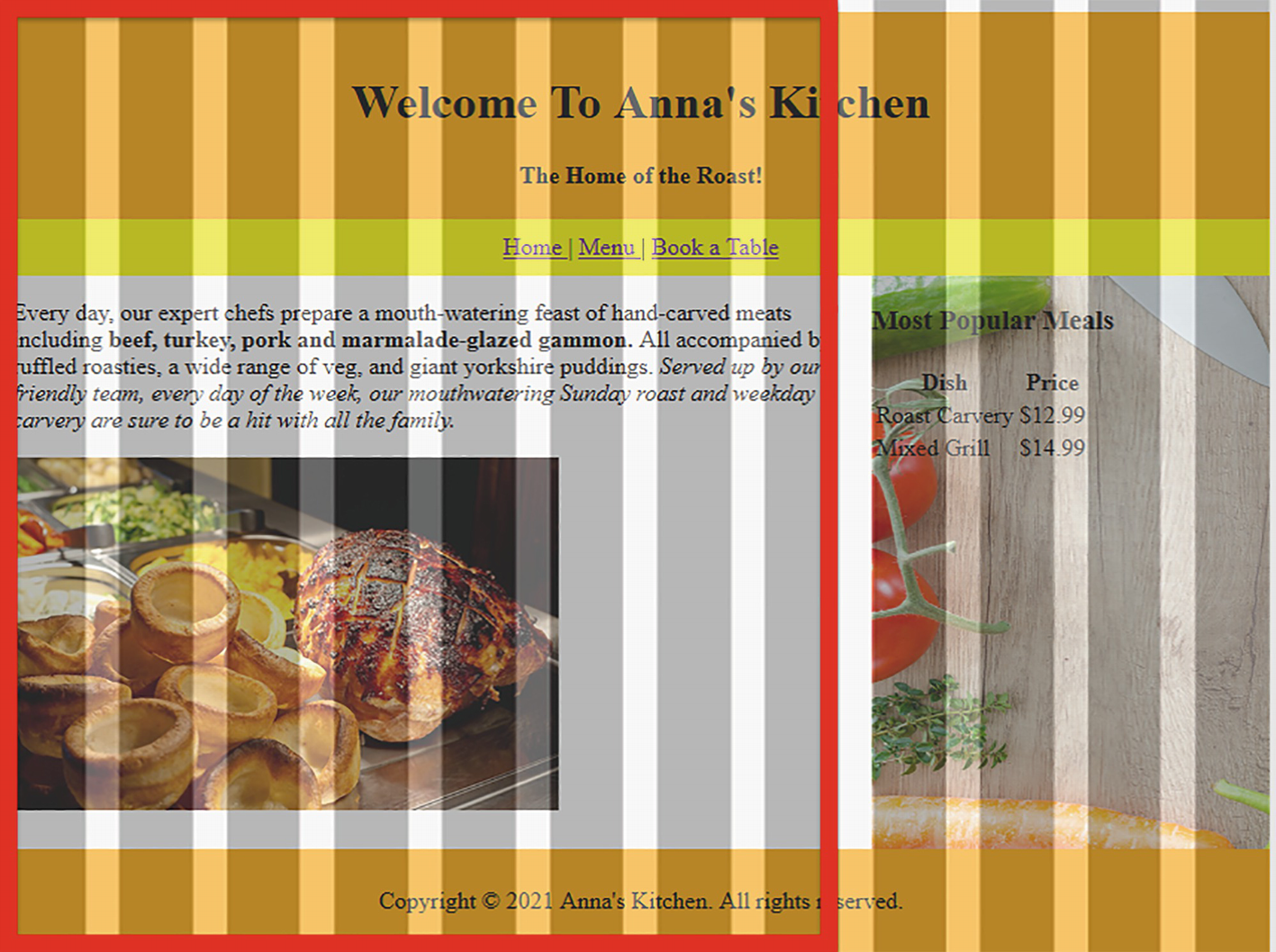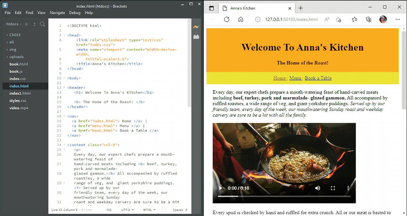 Two screenshots of the index dot h t m l, h t docs, and webpage screens. The 31-line code is on the h t m l screen. The Welcome to Annas Kitchen webpage is on the Annas Kitchen website.