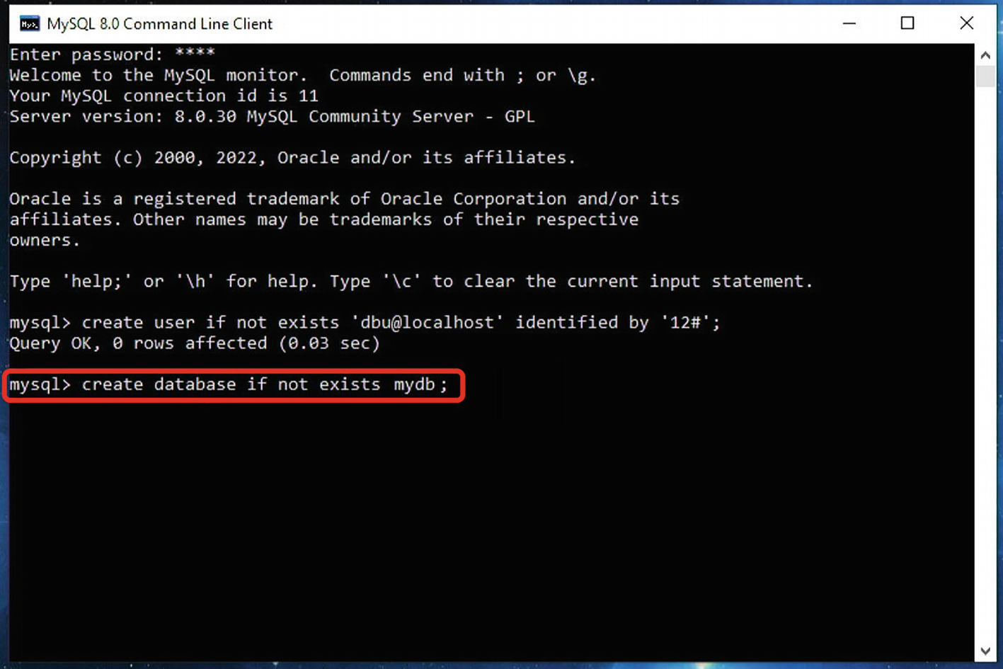 A screenshot represents the screen of the My S Q L 8.0 command line client with a set of commands. It highlights the line at the bottom that reads, create user if not exists d b u at local host identified by 12 hash.