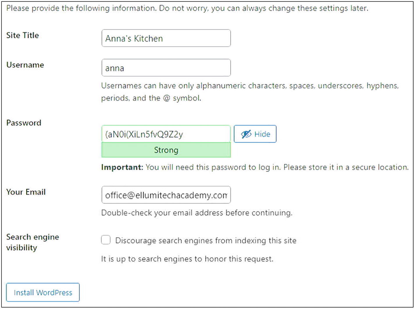 A screenshot represents the information detail screen. The fields to enter are the site title, username, password, email, and search engine visibility. It highlights the button at the bottom labeled install WordPress.