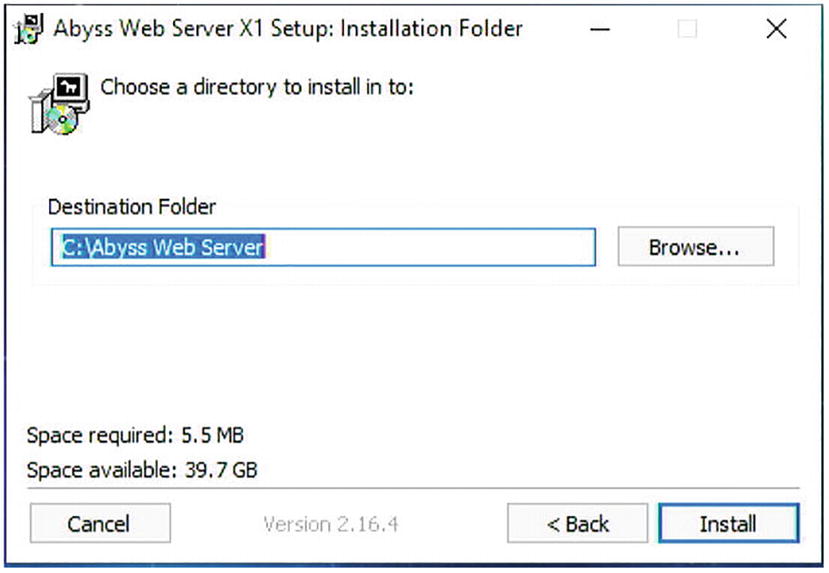 A screenshot of the Abyss Web Server X 1 setup and installation option for a directory to install the web page. It includes the destination folder text box and the browse button beside the text box. The cancel, back, and next buttons are at the bottom, where the next button highlights with a dark shade.