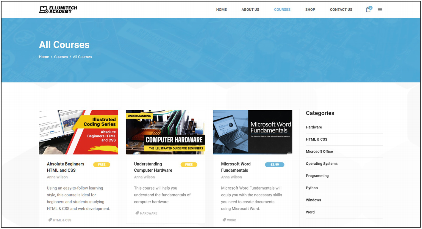 A screenshot represents the all-courses webpage of the Ellumitech Academy. It comprises the course for illustrated coding series, computer hardware, and Microsoft word fundamentals. There is a list of categories in the right sidebar.