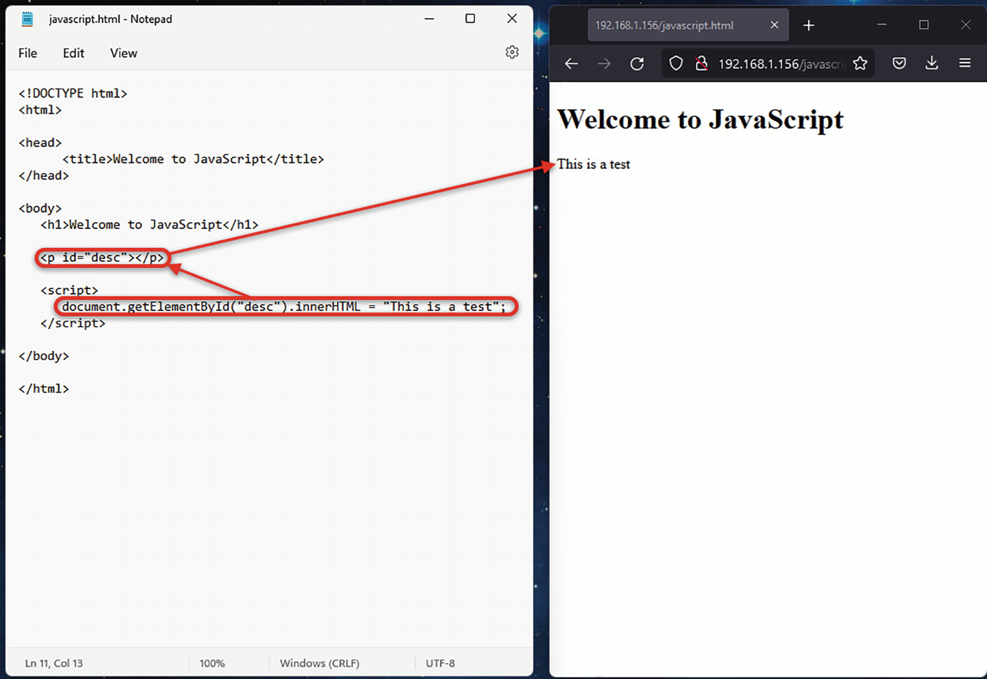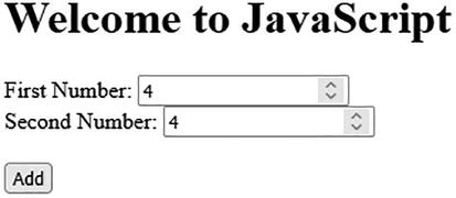 A screenshot of an h t m l file opened in a notepad, titled javascript 2 dot h t m l. On the right, it exhibits the execution of the h t m l code. It highlights the elements in the script used for entering the first and second numbers, the button to add, and the result at the bottom.