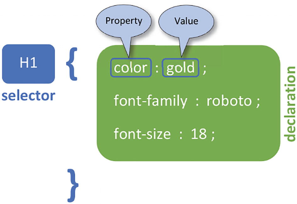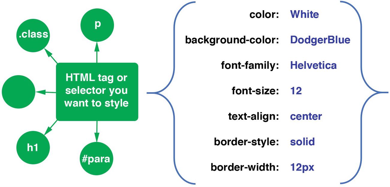 A schematic illustration of the H T M L tag or selector you want to style. It includes h 1, hash para, dot class, and p. The declaration box near the illustration denotes color, background color, font family, font size, text align, border style, and border width inside the curly braces.