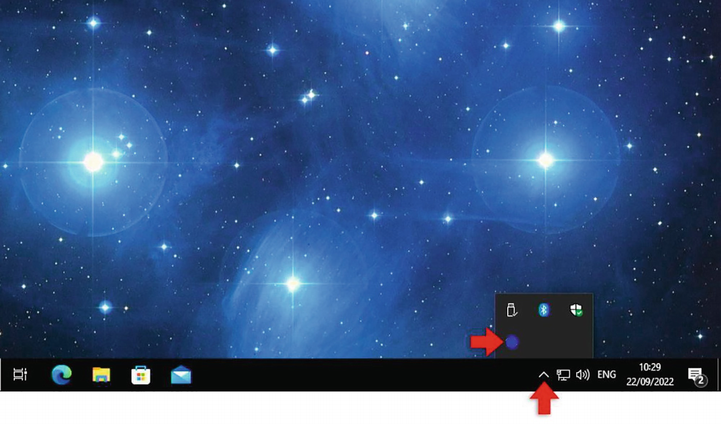 A screenshot of the computer window. Hidden icons are at the bottom right of the window has 4 options. A right arrow points to the Abyss web server icon, which is circular in shape.