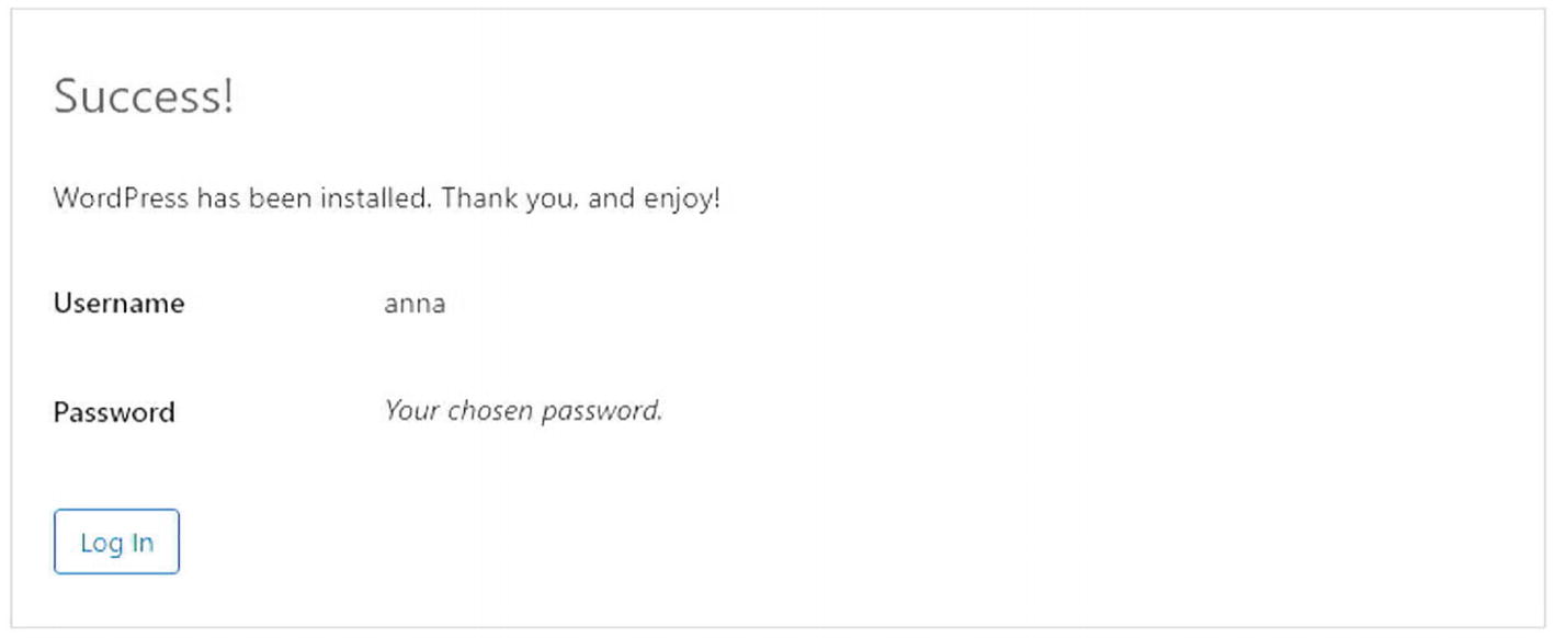 A screenshot exhibits the success message after the installation of WordPress. The screen displays the username and password. The option to log in is at the bottom, and it is selected.