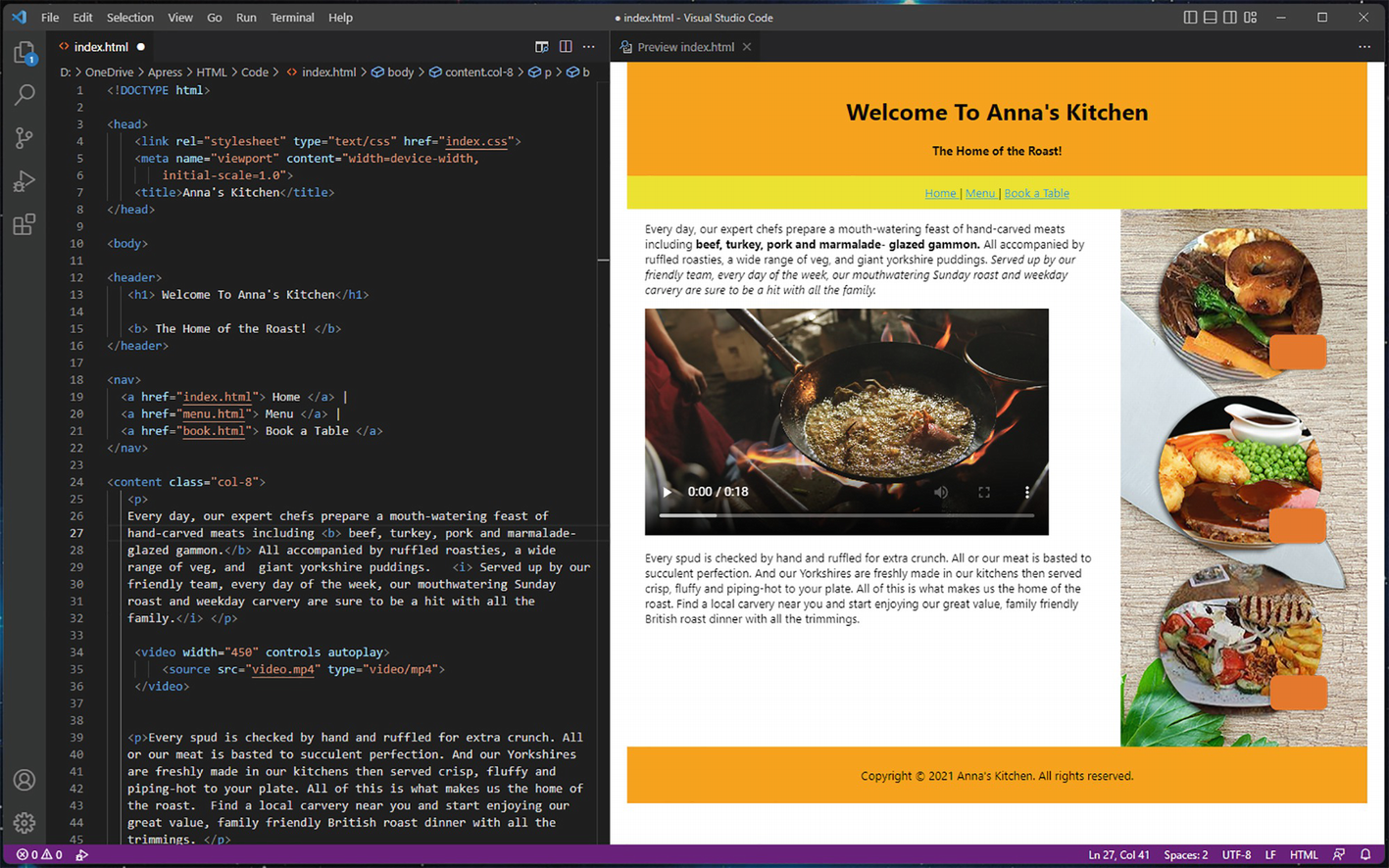A screenshot of the index dot h t m l h t docs-Visual studio code screen. The code is on the left. The preview index dot h t m l on the right displays the Welcome to Anna's Kitchen webpage.