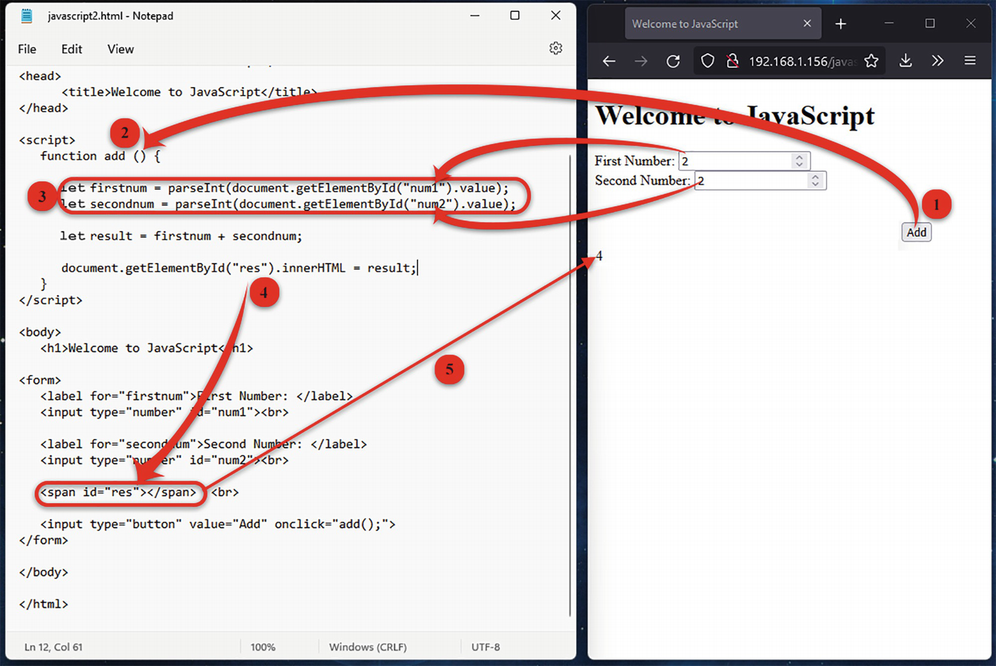 The value in result is then assigned to the HTML value of the span element on the HTML page. This is what displays the result (in this example, “4”).