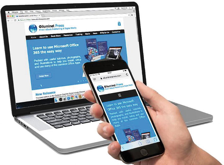 A photograph of the website is displayed on the screen of a laptop and a mobile phone. An illustration of the elluminet press website screen on a laptop and a mobile phone. A persons hand holds a mobile phone.