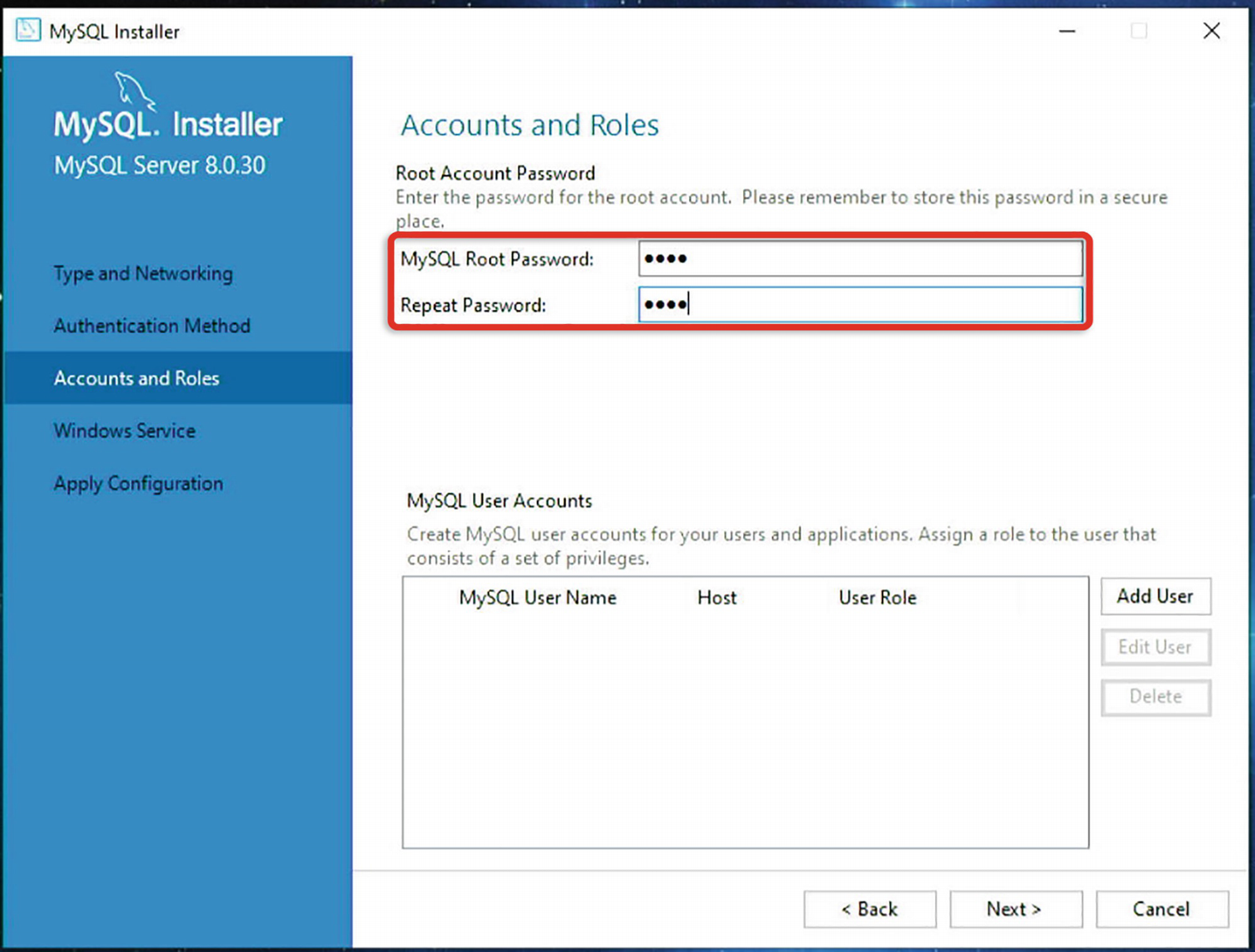 A screenshot of the My S Q L Installer page. It highlights the options of accounts and roles on the left panel. The right part of the screen highlights the inputs for the My S Q L root password and repeat password. Below is a table with the columns my s q l user name, host, and user role and indicates the button to add a user.