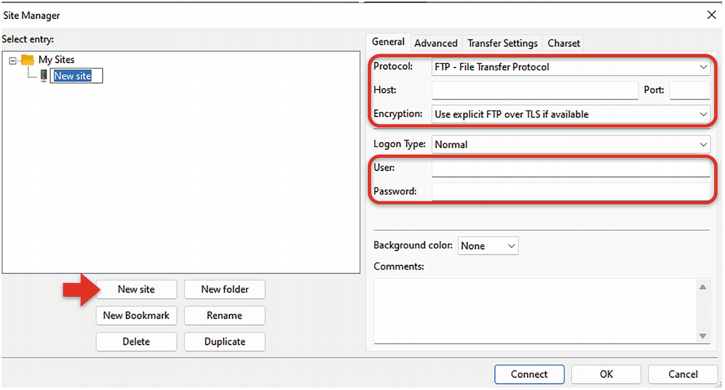 A screenshot of the site manager. The select entry block has my site with a new site option. On the right, there are 4 options. The general option has a text box and dropdown options for protocol, host, encryption, logon type, user, and password. A right arrow points new site option. The connect, ok, and cancel buttons are at the bottom.