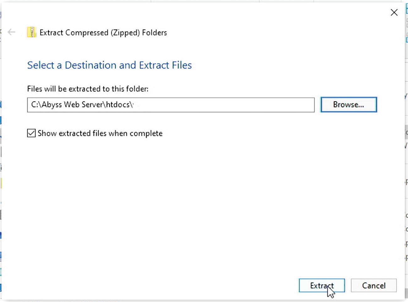 A screenshot of a dialog box to extract compressed zipped folders. The screen exhibits the path of the destination inside c drive. It highlights the extract button at the bottom.