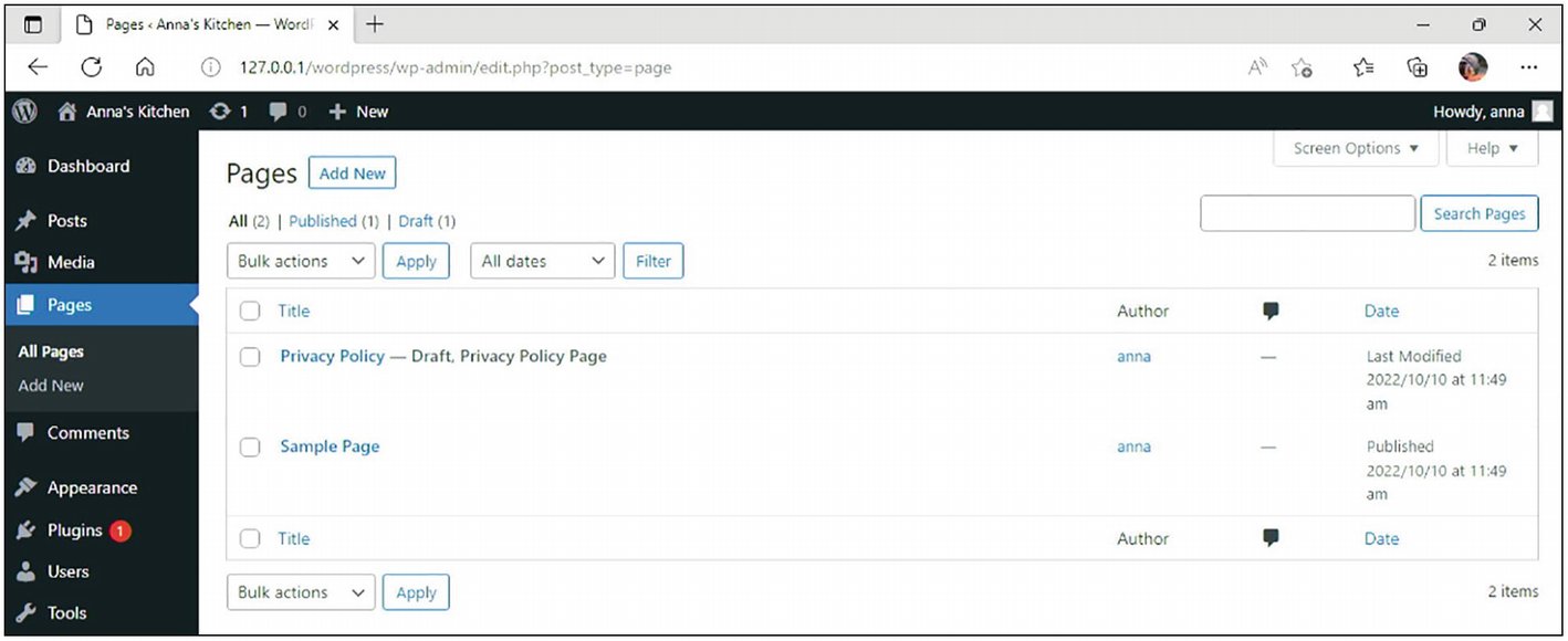 A screenshot of the WordPress dashboard of Anna's Kitchen. It highlights the pages option on the left panel. The right part of the screen provides a table with a list of the available pages along with the option to add a new page.