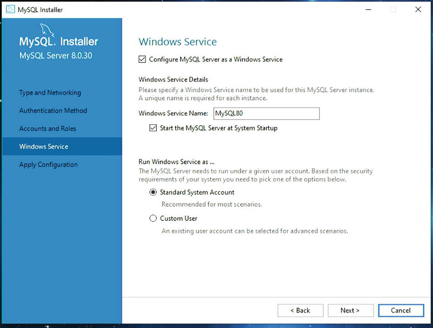 A screenshot of the My S Q L Installer page. It highlights the option for windows service on the left panel. The right part of the screen exhibits the details of the windows service name along with the options for my s q l configuration and running windows service as a standard system account.